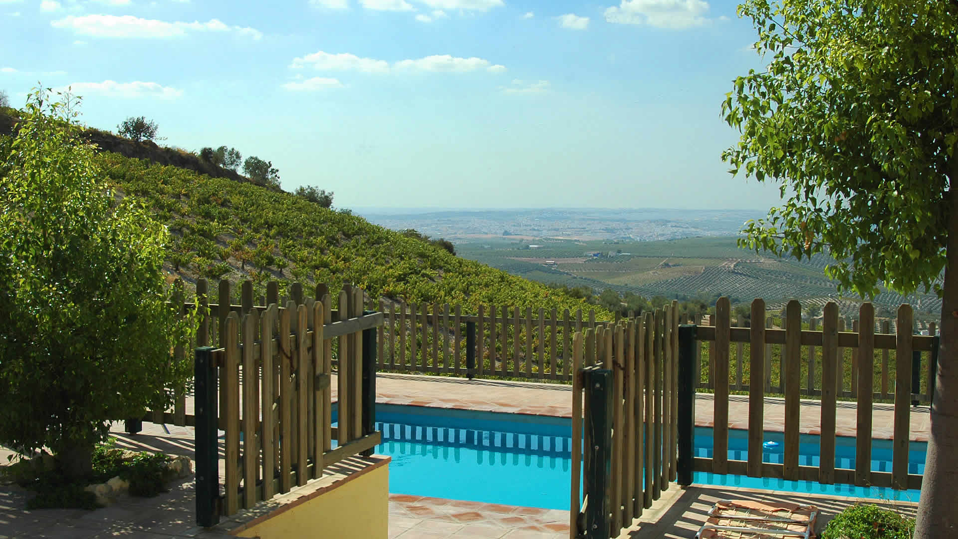 This villa is adjacent to ref. Cordoba 006a, both sharing a tempting pool. You wanted a private pool? That's still possible! Upon request and with surcharge, we promise not to rent the adjacent property so you will have the pool exclusively for yourselves. Please note that this arrangement is not possible in July and August. The situation of the house can't be more typical: everywhere you look are vines, the proud of Montilla. A visit to the bodega's, a.o. Alvaer and Robles, is almost an obligation and very interesting, especially during harvest, when you can follow the whole process of winemaking from beginning to end. The village of Montilla itself is a 10-minute drive away (9 kms) and very traditional Andalucian, with tapa bars, family-run restaurants and shops. For an excursion, you will certainly enjoy the old centre of Córdoba with its' world famous mosque and Jewish quarter. Historical cities of Antequera and Granada are also worth a visit whilst watersporters will enjoy the nearby lake of Iznajar. The outside area of the house includes a playground for children with a little wooden playhouse (shared with Cordoba 006a). The pool (10 x 5 mts) is set in a gated area, ensuring safety for the younger ones. The veranda is an excellent place for your alfresco meals, a barbecue is provided.