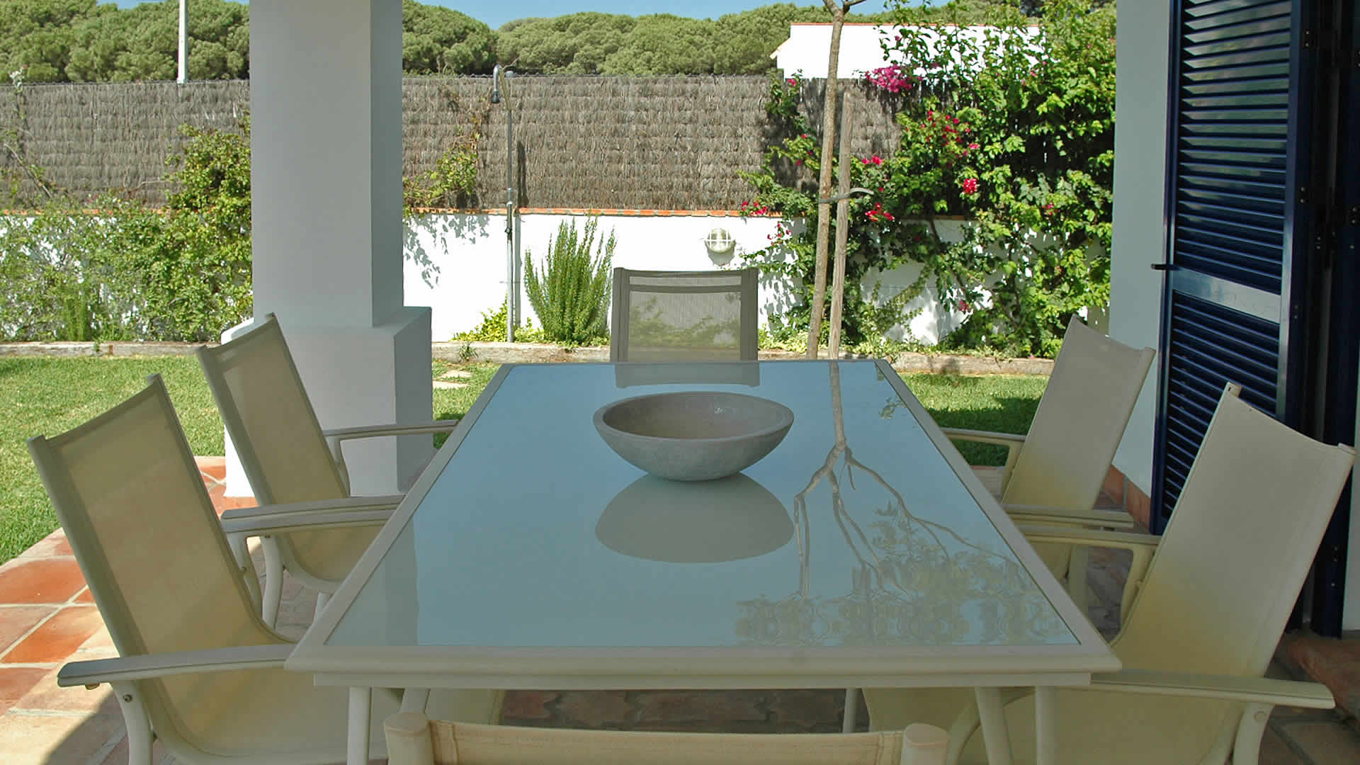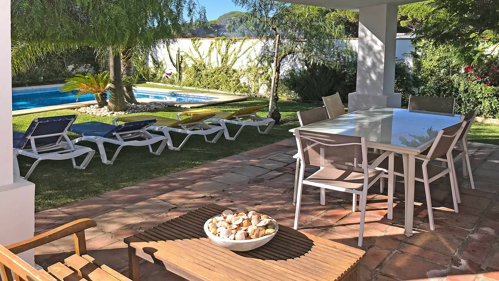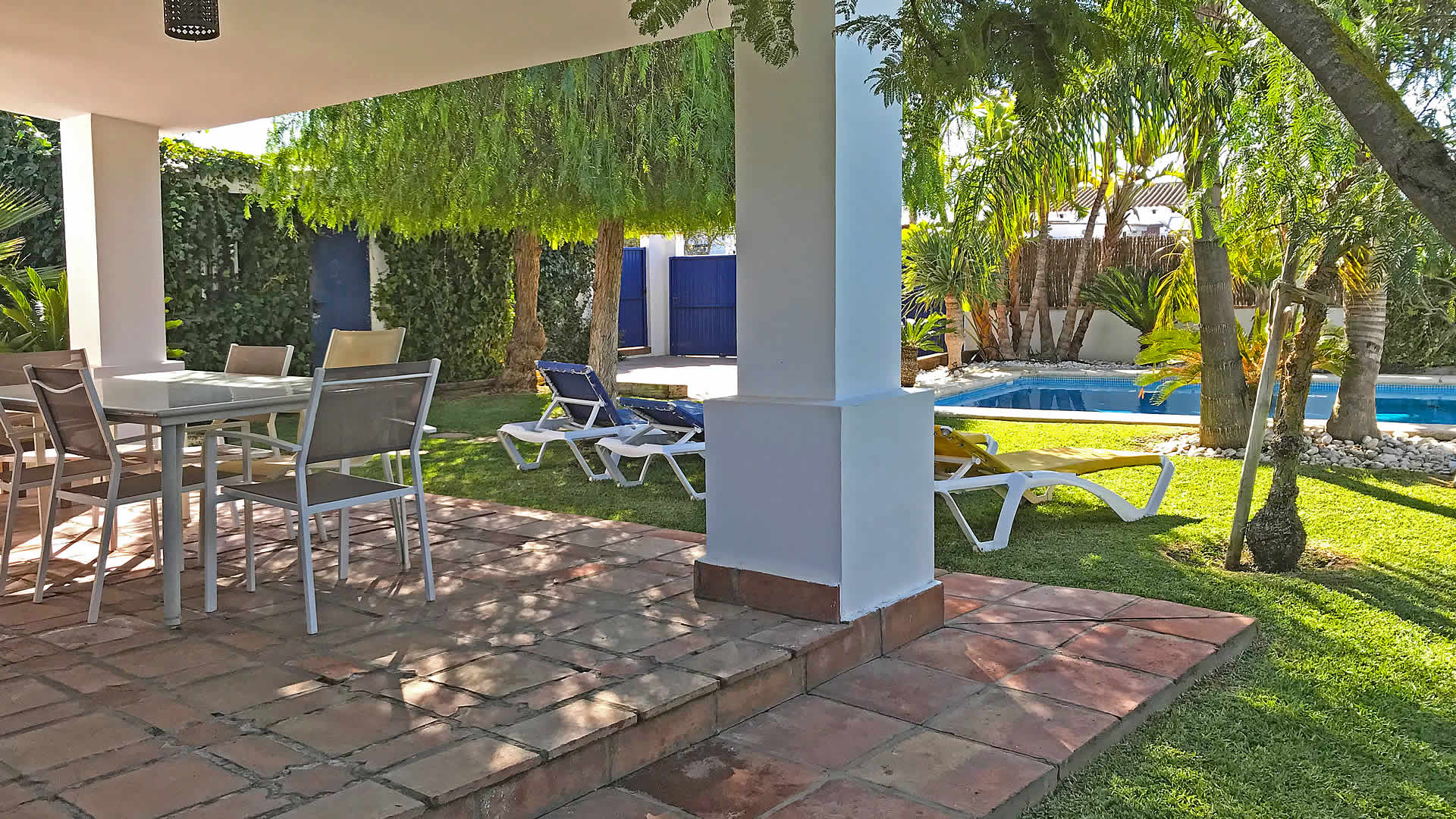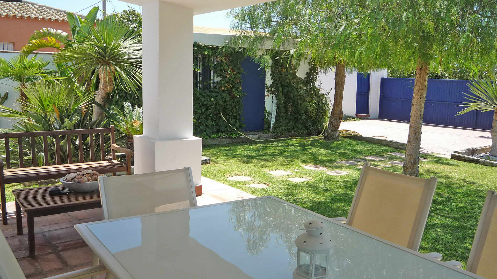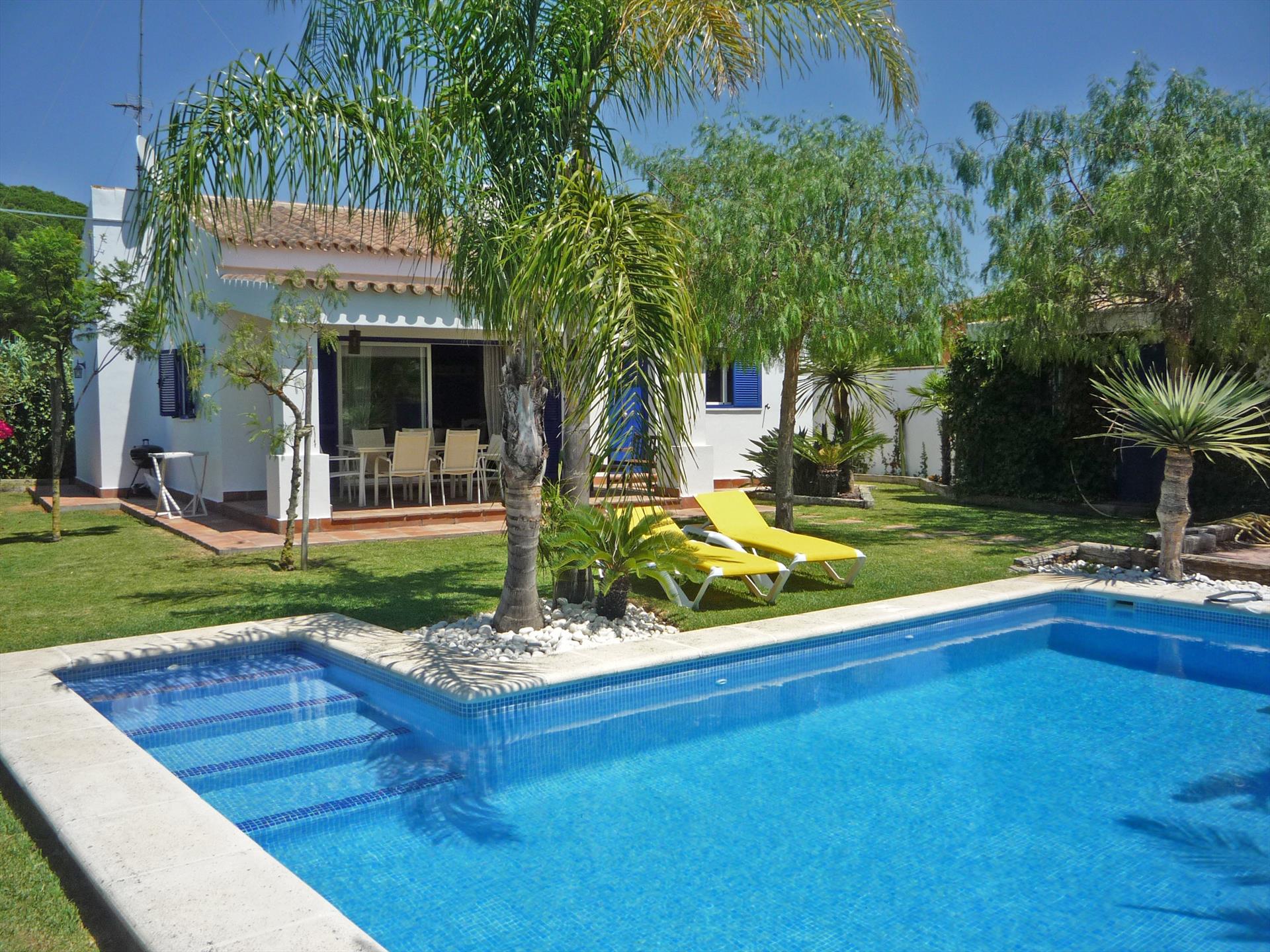 The lovely, tropical garden has a lawn with 2 sun loungers surrounding the tempting private pool (7x4 m). The shaded veranda looks out over the garden and pool, making it a perfect setting for your alfresco dinners; patio furniture and a barbecue are provided. The villa is set in Majadales de Roche, a rural settlement of Conil de la Frontera 3.5 km from the beaches of Roche, known to be the best in the area. If you can tear yourself away from this idyllic spot, then visit the city of Cadiz with its rich history, or the pretty town of Jerez de la Frontera where you can visit the famous horse show (on Thursdays) and several bodegas where sherry-wine is made.
