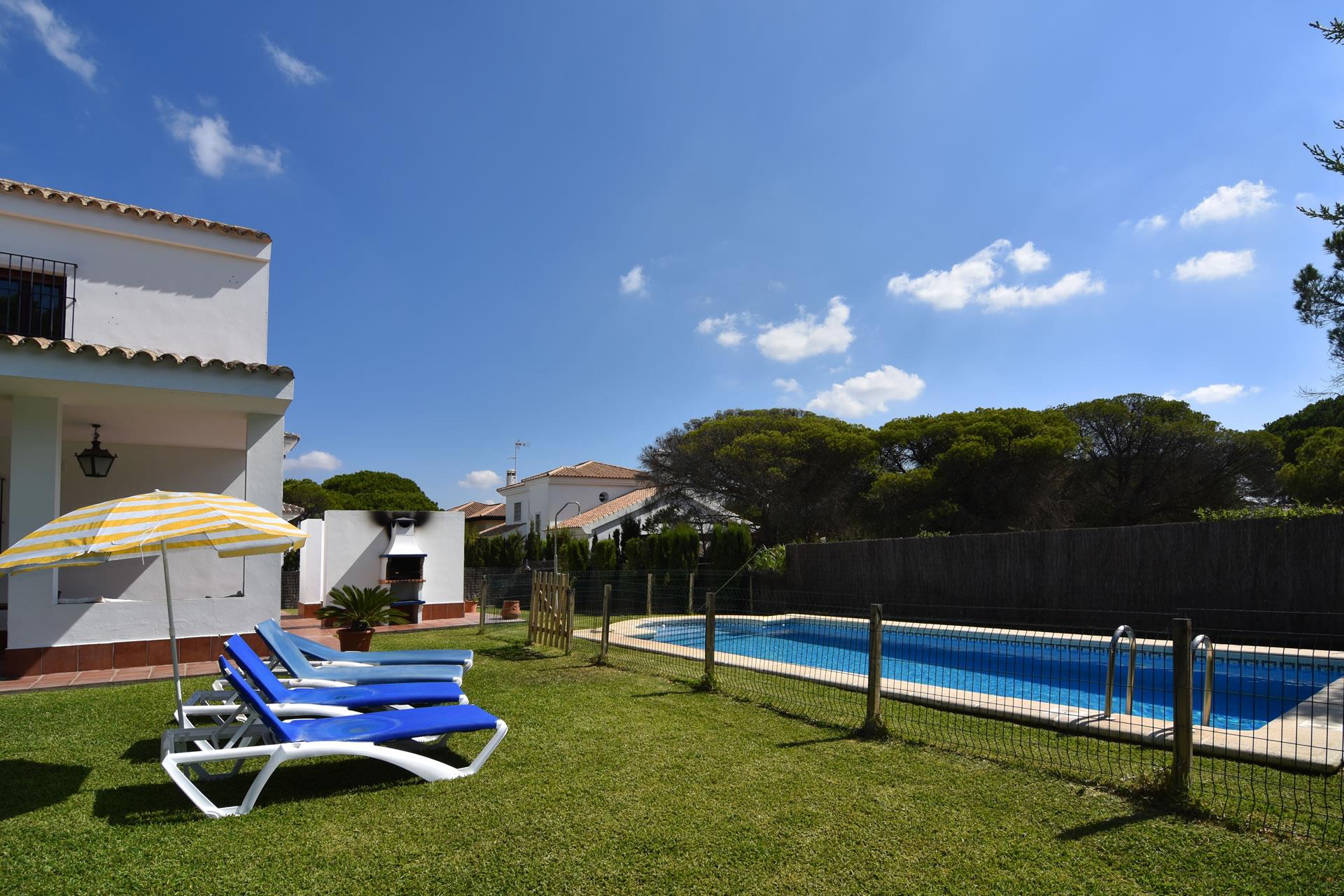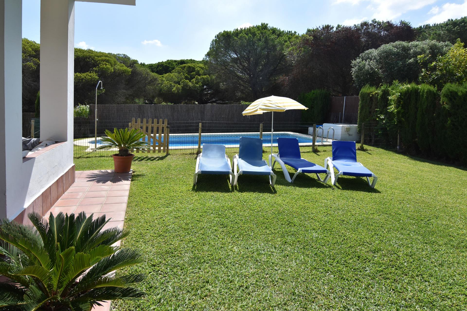 What else could you possibly wish during your holiday? A lovely garden with lawn and an attractive private pool (4x8 m), quiet surroundings with possibilities to play tennis, paddle, or volleyball, beautiful beaches at a walking distance (700 m)… all ingredients for a perfect holiday! A barbecue for your alfresco meals and patio furniture and sun loungers are provided. A supermarket, restaurant, bar, and newspaper shop are a 5 minute walk whilst larger facilities can be found in Conil de la Frontera itself, which is a 10-15 minute drive away (7 km). From here it’s also easy to discover some of the highlights of Andalusia, such as the city Jerez de la Frontera with its famous sherry-wine cellars and Andalusian horse show, or you can drive along the White Villages that start at the antique city of Arcos de la Frontera. If you are at all looking to get away from this idyllic spot, then a visit to Sevilla will remind you of the glamorous Moorish heritage of this part of Spain.