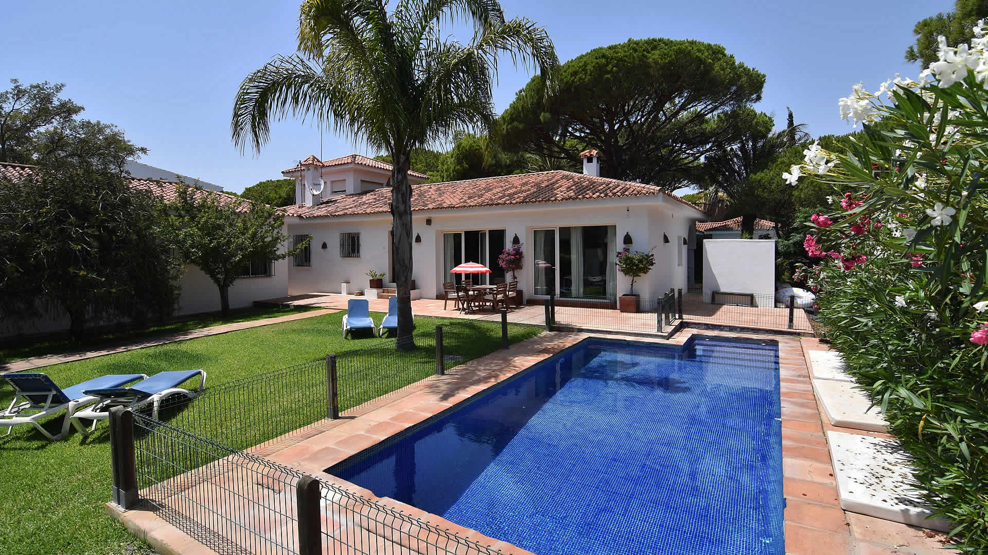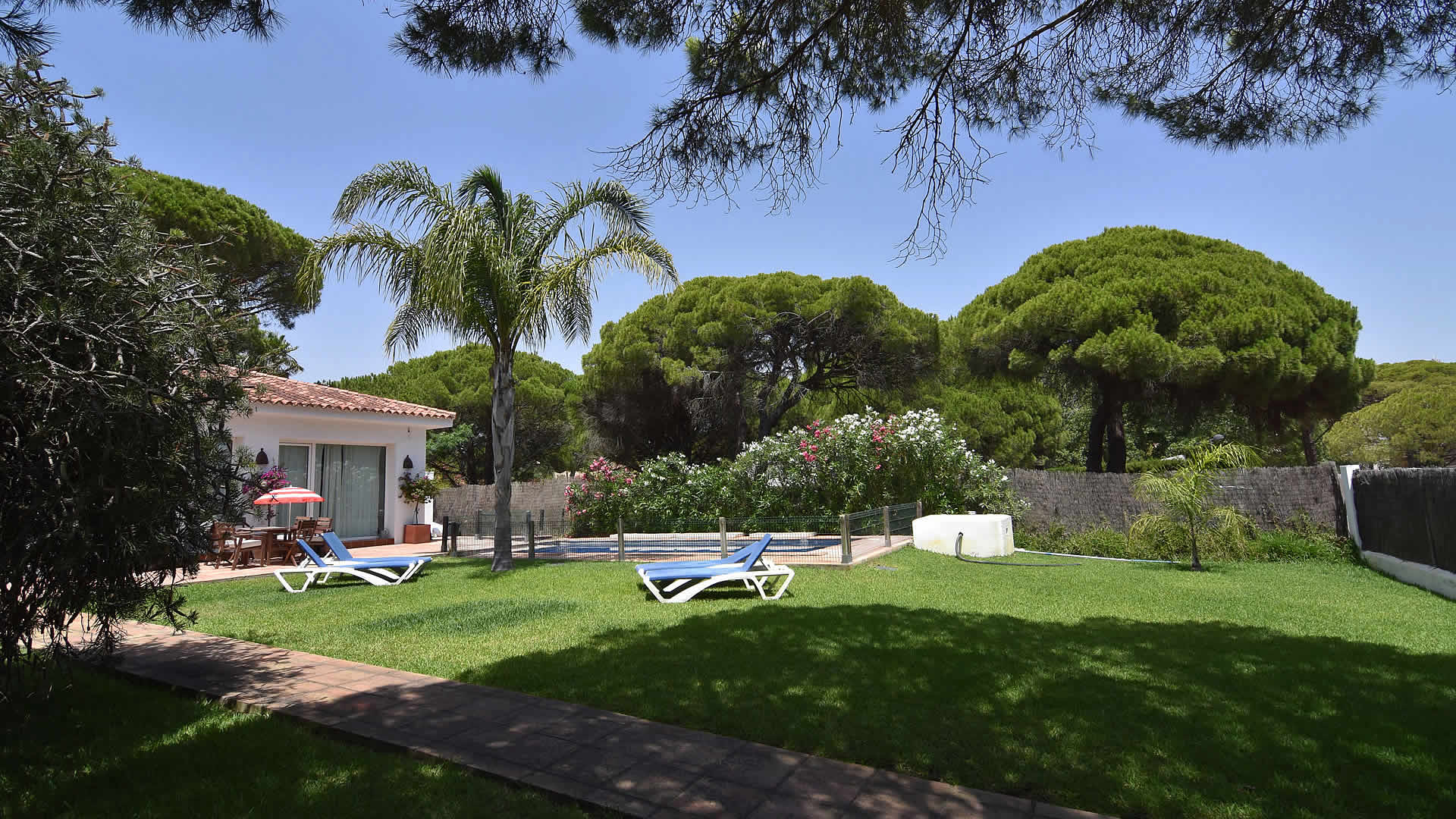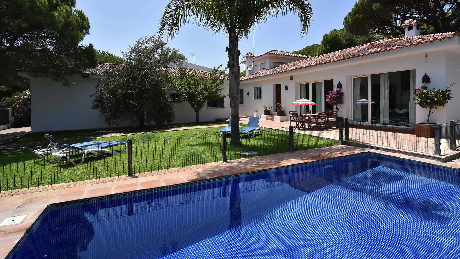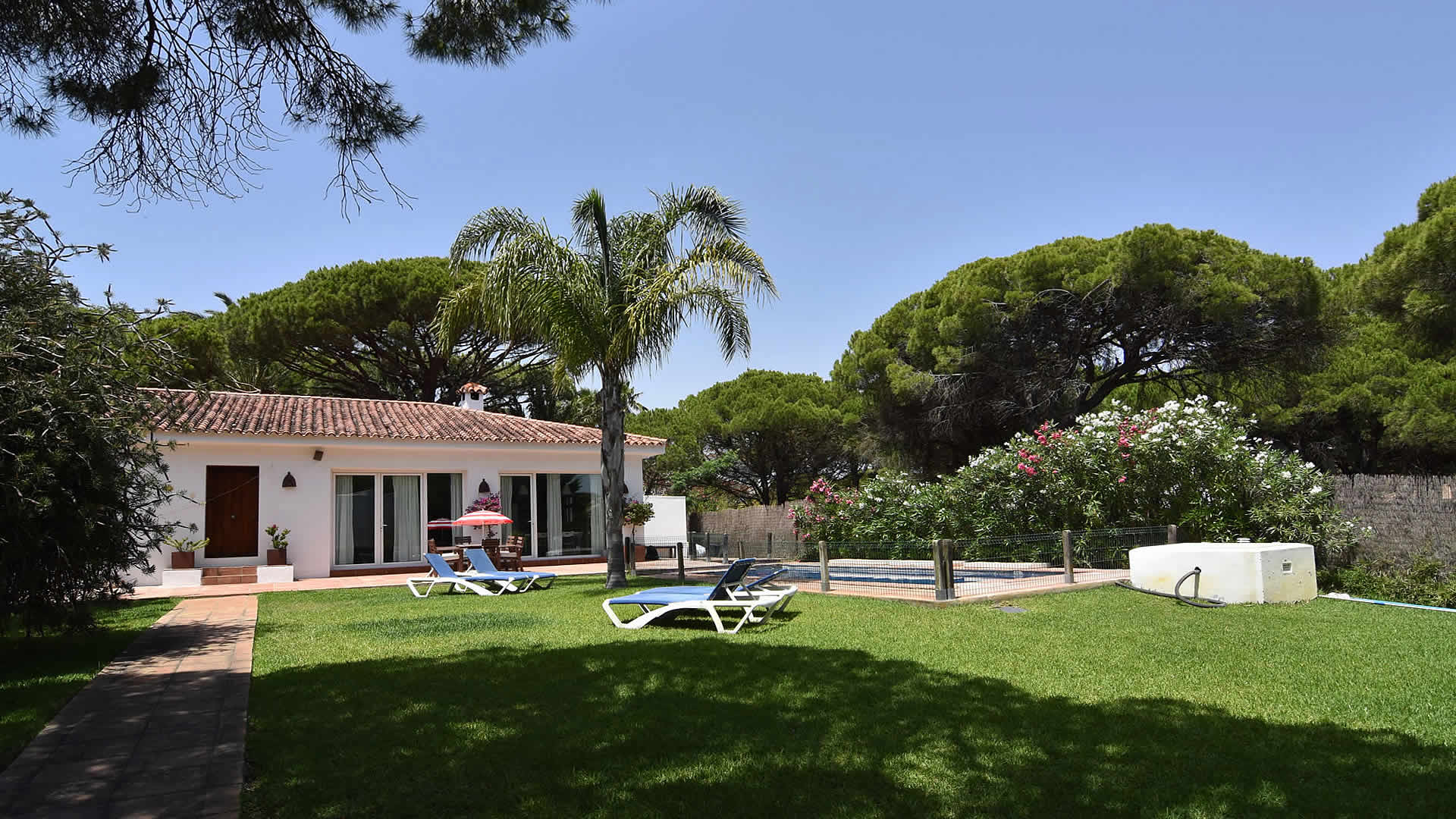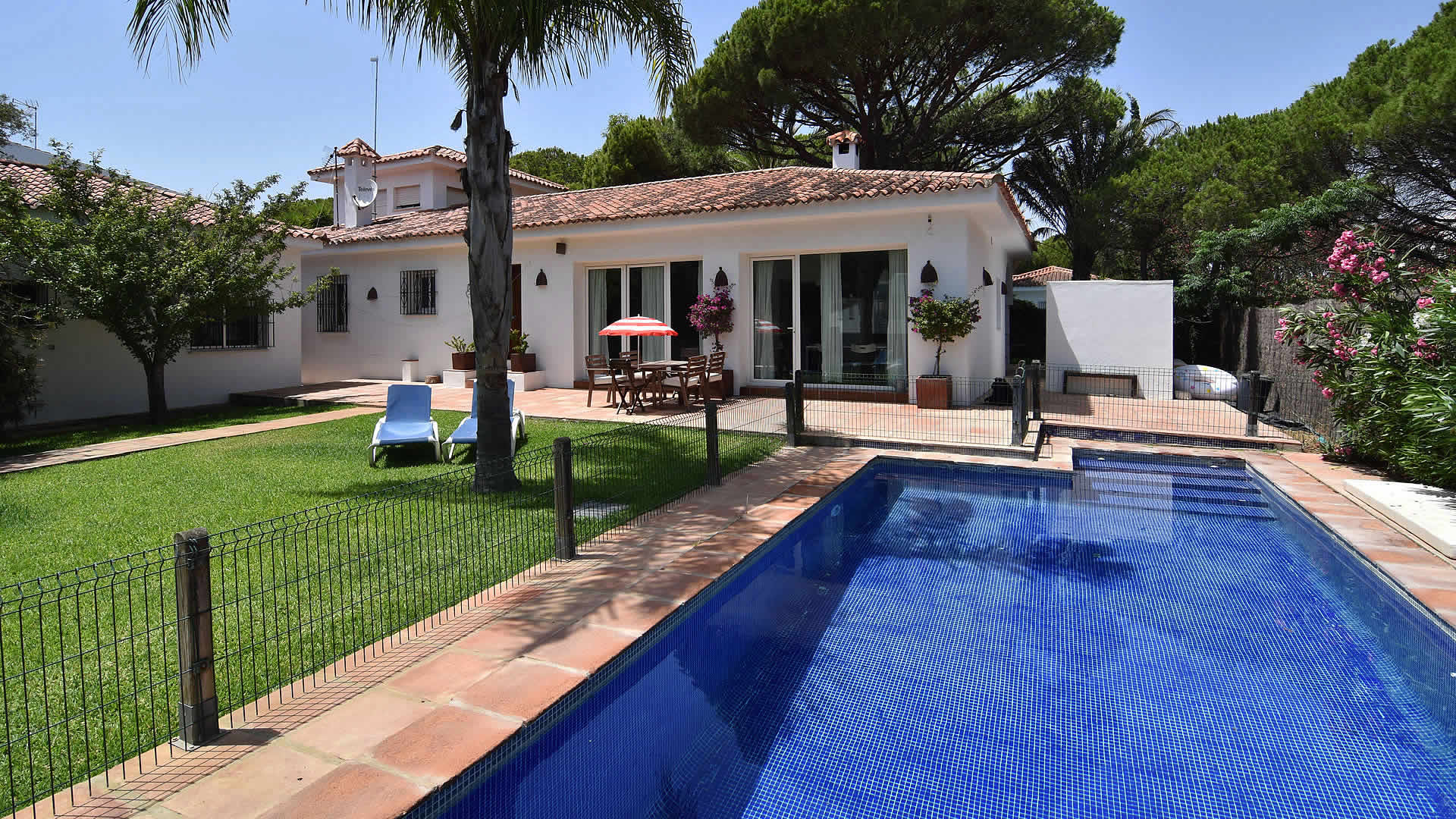 The town of Conil de la Frontera (7 km) can be reached in 10 minutes by car and provides more extensive facilities and a good selection of restaurants and tapa-bars. Especially in the summertime, Conil is a city with a humming nightlife! The area also provides possibilities to play tennis, paddle, or volleyball. There are several golf courses in the surroundings, of which Sancti Petri Golf is the nearest (1 km). If you fancy discovering the area, then don't forget to visit the famous horse show in Jerez de la Frontera, every Thursday, and one of the famous bodegas such as Gonzalez Byass. The cities of Cádiz and Sanlúcar de Barrameda are also very interesting, whilst Sevilla and the city of Ronda are the highlights of western Andalusia and a bit more than an hour drive away. The outside areas of the villa include a lovely garden of 1,400 m2 with lawn and two terracesone facing south for sun bathing and the other facing north, ideal for a lazy siesta in the shade. For the commodity of families with smaller children, the pool area has been fenced. Patio furniture, 2 sun loungers, and a barbecue for your alfresco dinners are provided, making this a very complete property suiting many tastes.