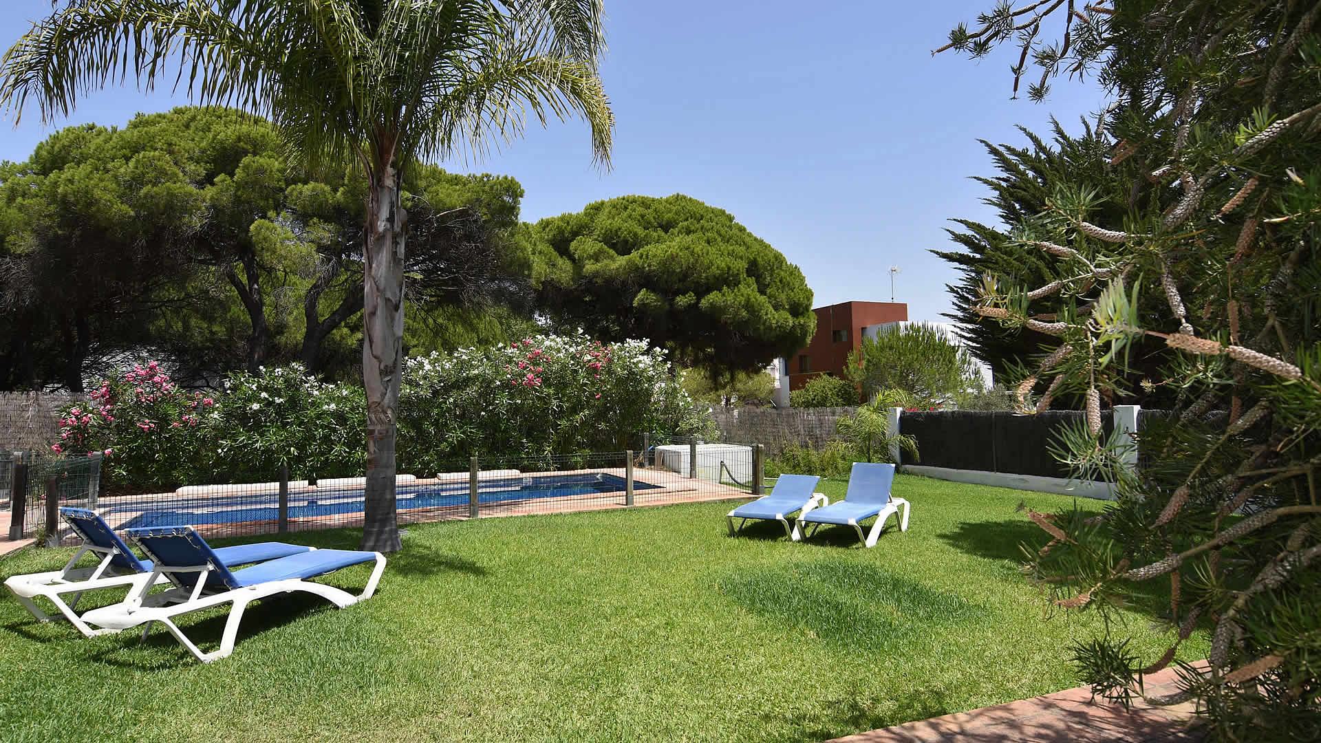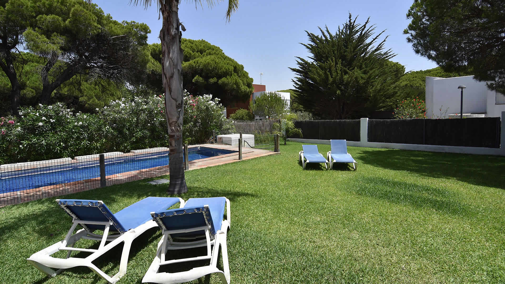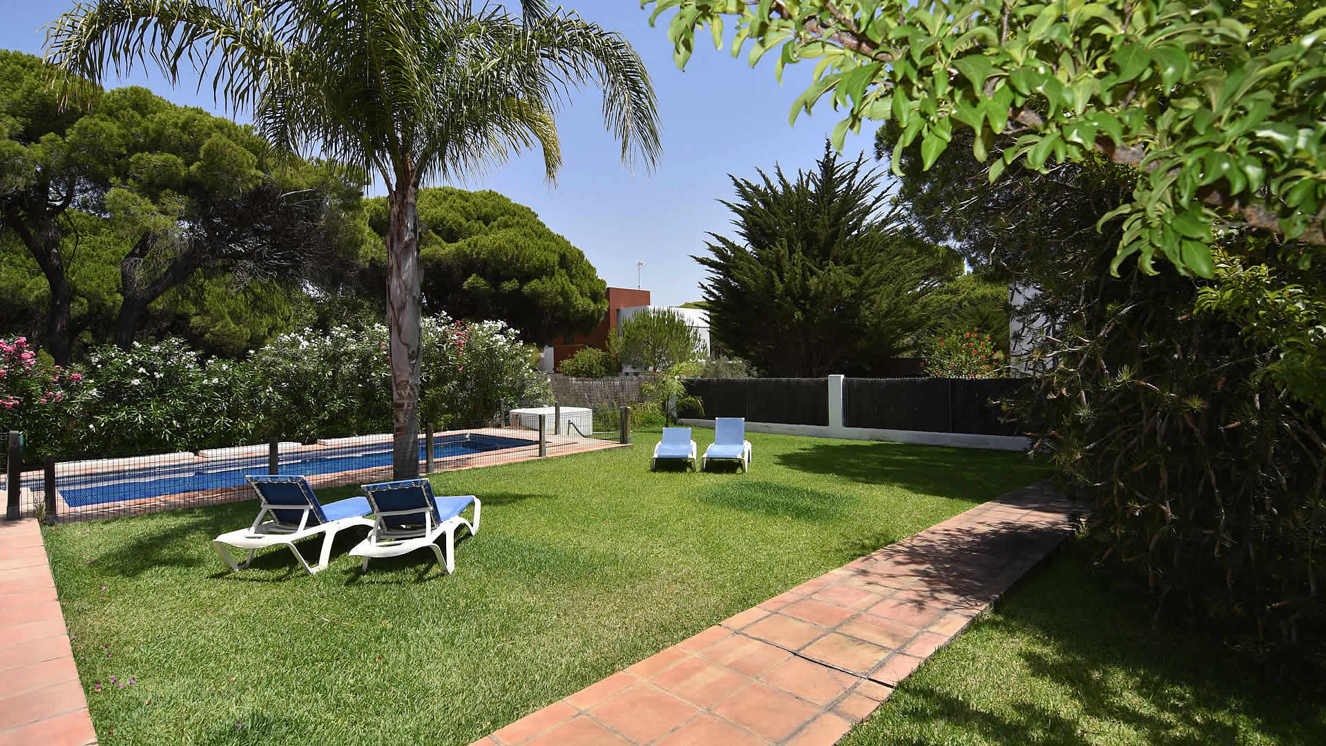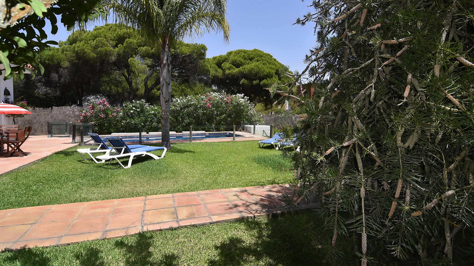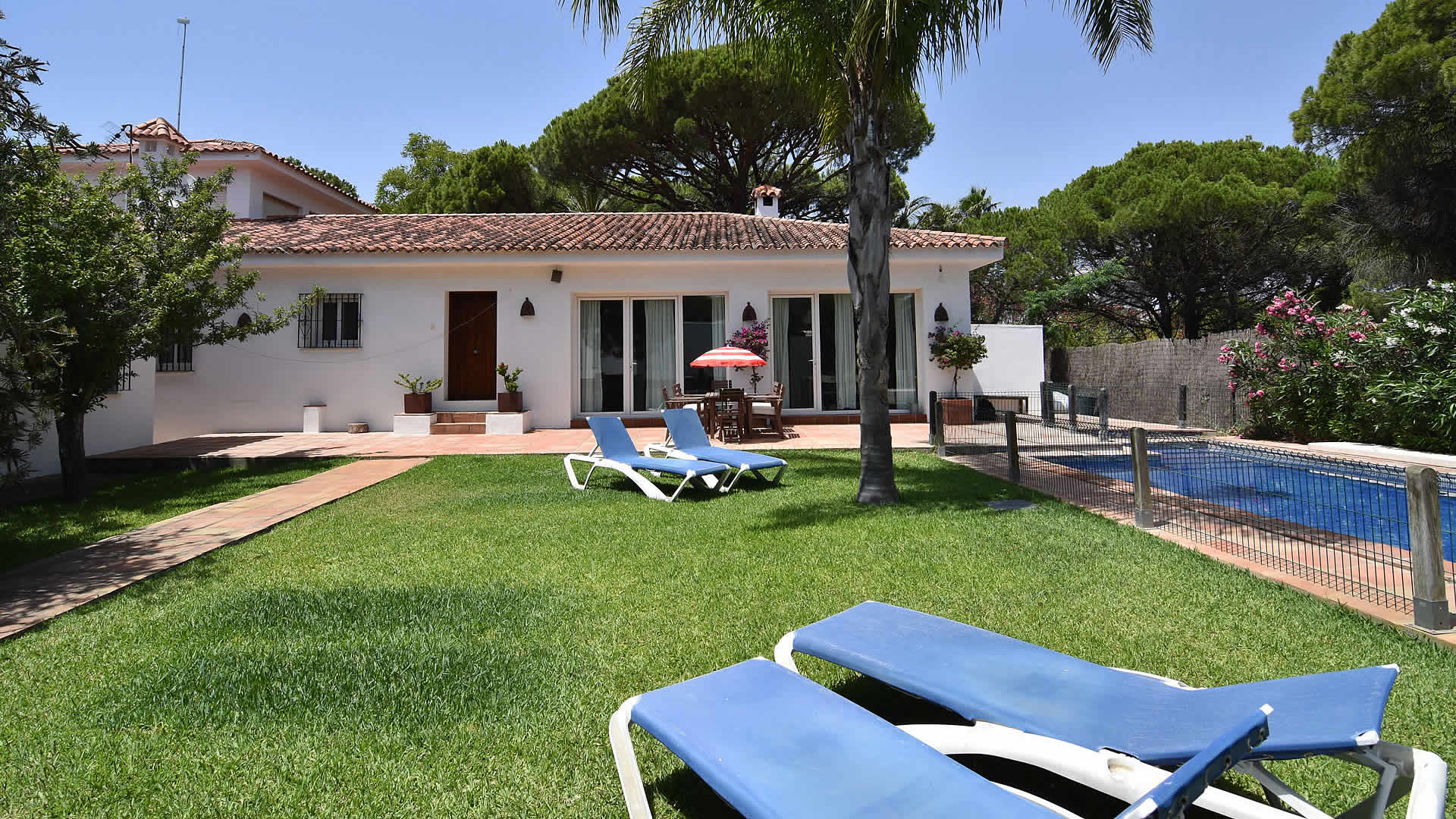 The town of Conil de la Frontera (7 km) can be reached in 10 minutes by car and provides more extensive facilities and a good selection of restaurants and tapa-bars. Especially in the summertime, Conil is a city with a humming nightlife! The area also provides possibilities to play tennis, paddle, or volleyball. There are several golf courses in the surroundings, of which Sancti Petri Golf is the nearest (1 km). If you fancy discovering the area, then don't forget to visit the famous horse show in Jerez de la Frontera, every Thursday, and one of the famous bodegas such as Gonzalez Byass. The cities of Cádiz and Sanlúcar de Barrameda are also very interesting, whilst Sevilla and the city of Ronda are the highlights of western Andalusia and a bit more than an hour drive away. The outside areas of the villa include a lovely garden of 1,400 m2 with lawn and two terracesone facing south for sun bathing and the other facing north, ideal for a lazy siesta in the shade. For the commodity of families with smaller children, the pool area has been fenced. Patio furniture, 2 sun loungers, and a barbecue for your alfresco dinners are provided, making this a very complete property suiting many tastes.