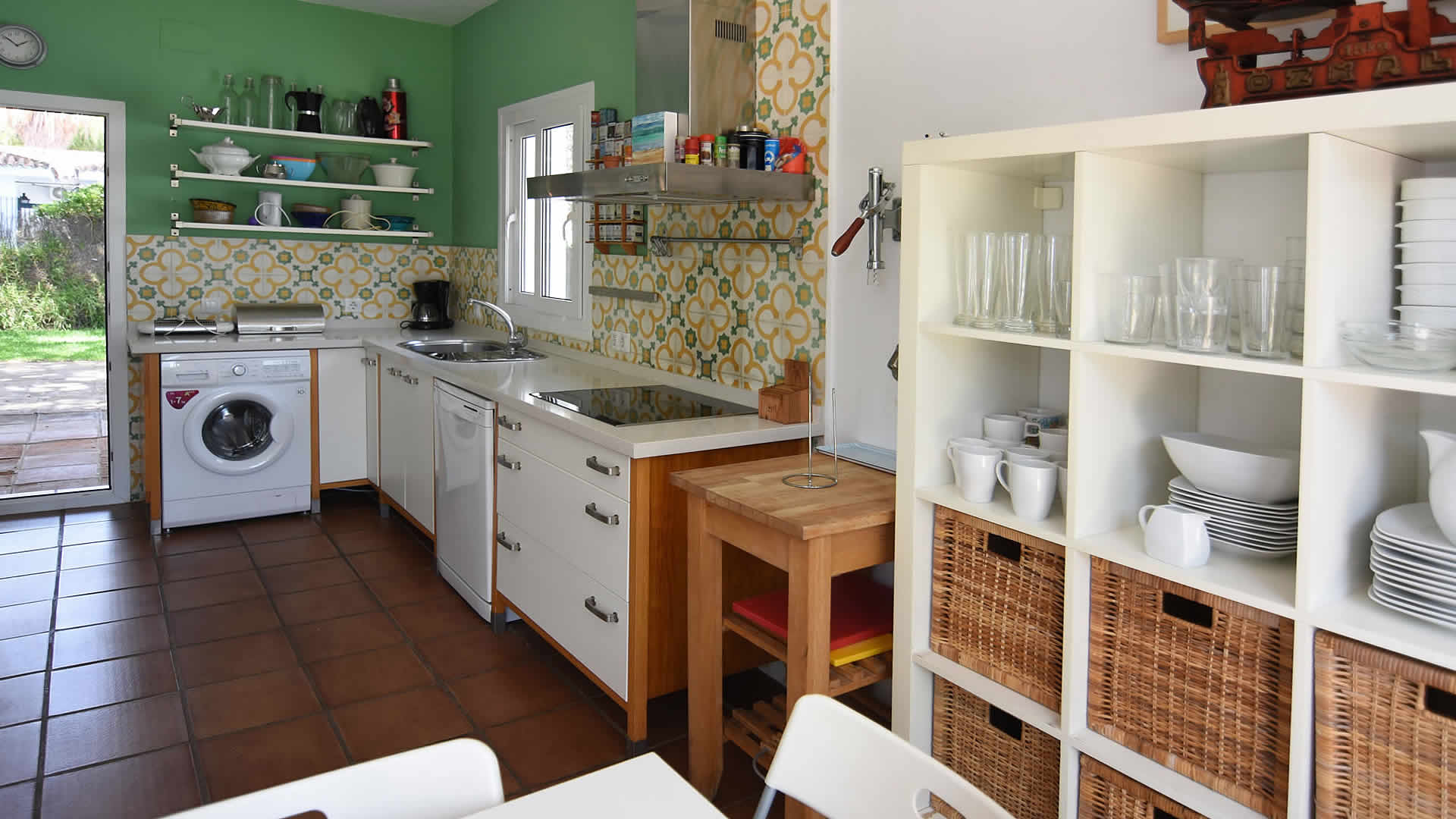 MAIN HOUSE: all rooms are located on the ground floor, except for one double bedroom located on the first floor. The villa is well maintained and decorated with very comfortable, elegant furniture. The equipment includes a CD-player, television, and DVD. The living/dining room and kitchen are very spacious, the last equipped with a ceramic hob, oven, fridge/freezer, microwave, dishwasher, washing machine, and all kinds of kitchen utensils such as an orange squeezer, an electric batter, etc. There are three double bedrooms, one twin bedroom and 2 bathrooms in the main house. A WC is adjacent to the bedroom.