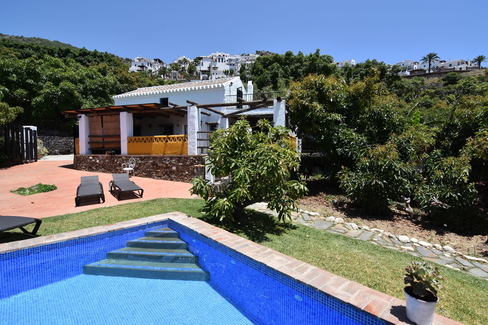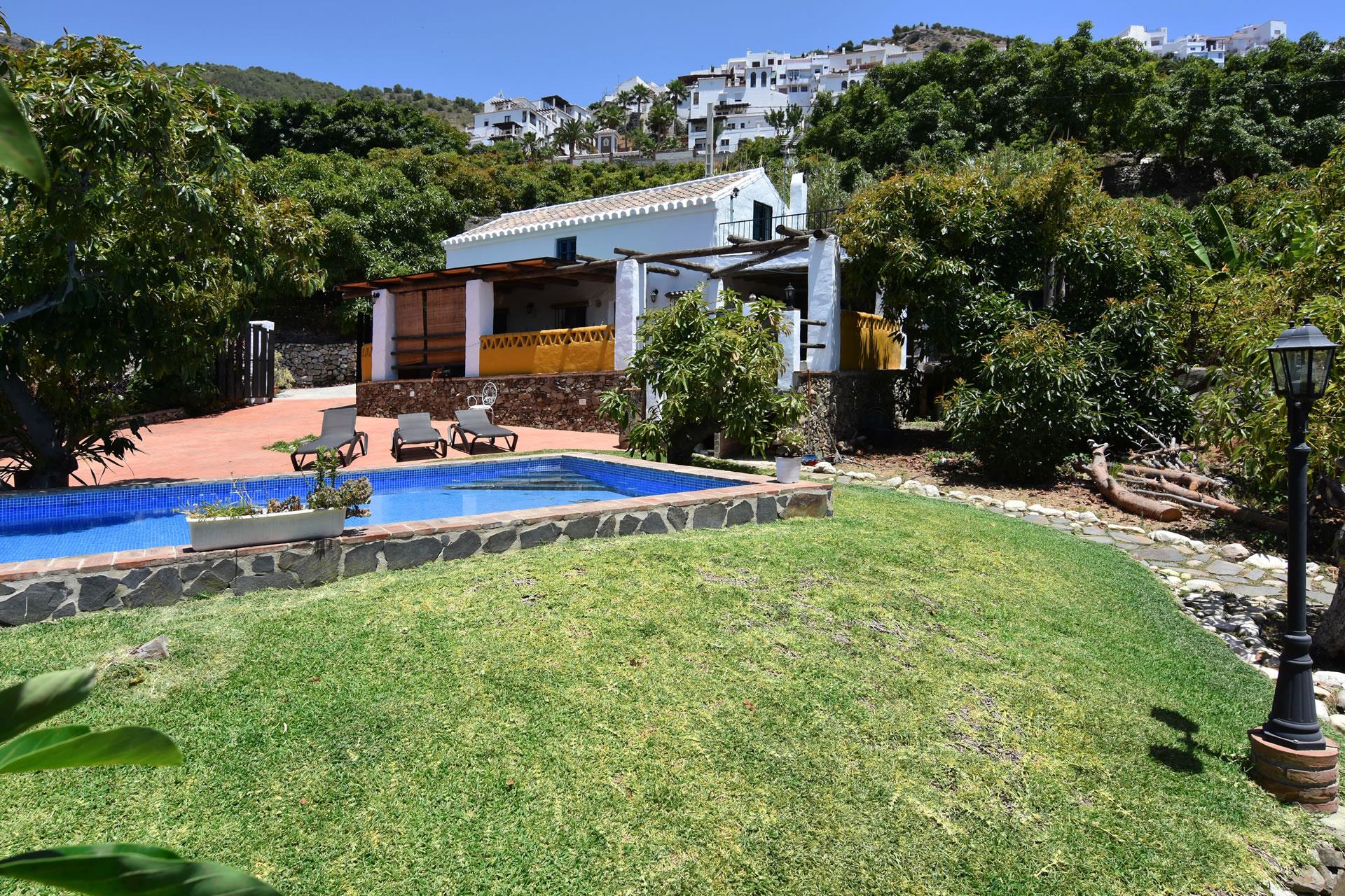 The cottage has a large pool (4x7.5 m long and 1x1.5 m deep) with a lawn area and a pretty sun terrace—sun loungers are provided for sun bathing and relaxing. The accommodation is also ideally located for exploring the impressive Moorish heritage of the Andalucian cities of Granada, Sevilla and Cordoba, amongst others. The town of Nerja and its beaches can be reached in 10 minutes by car.