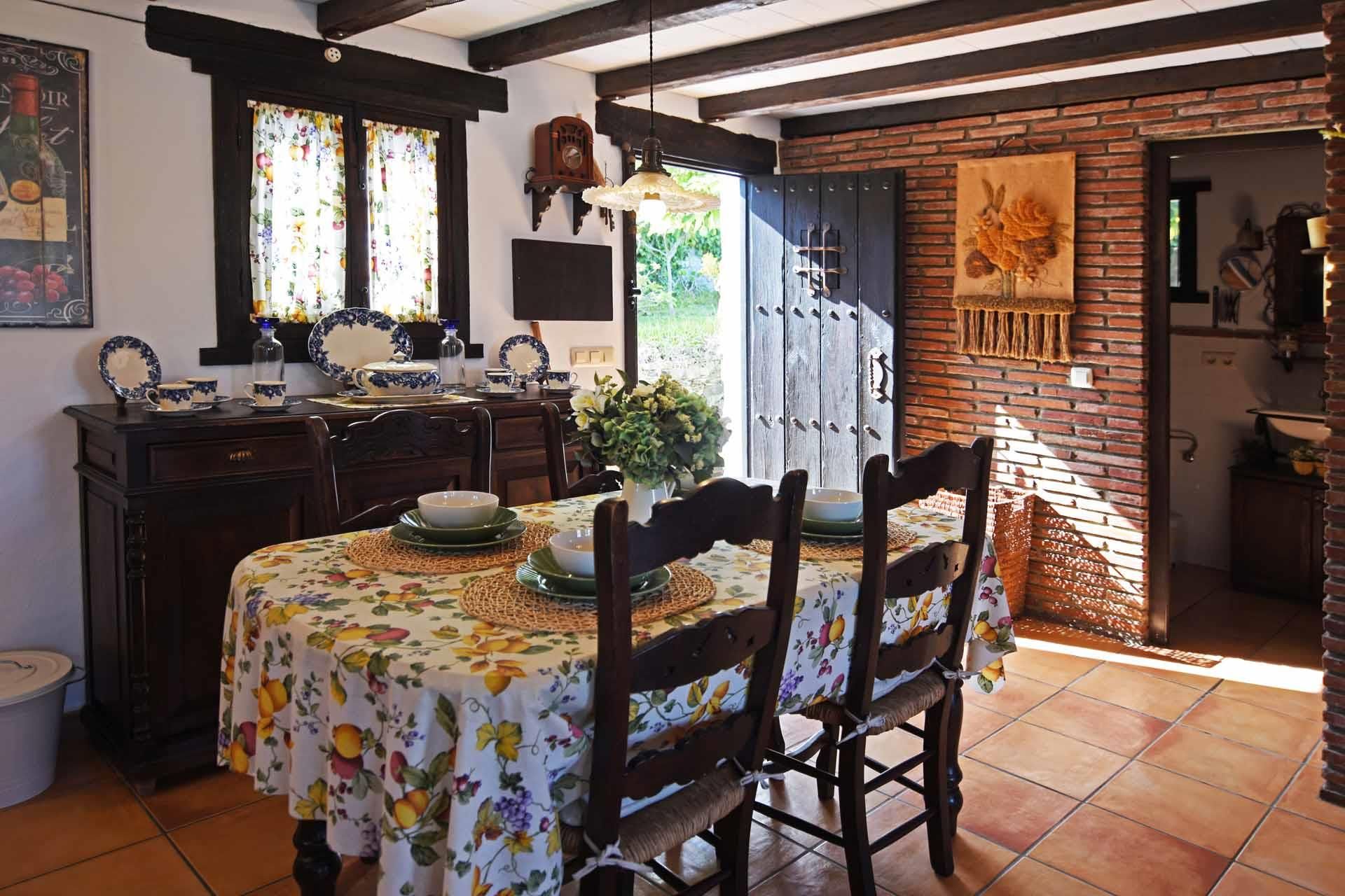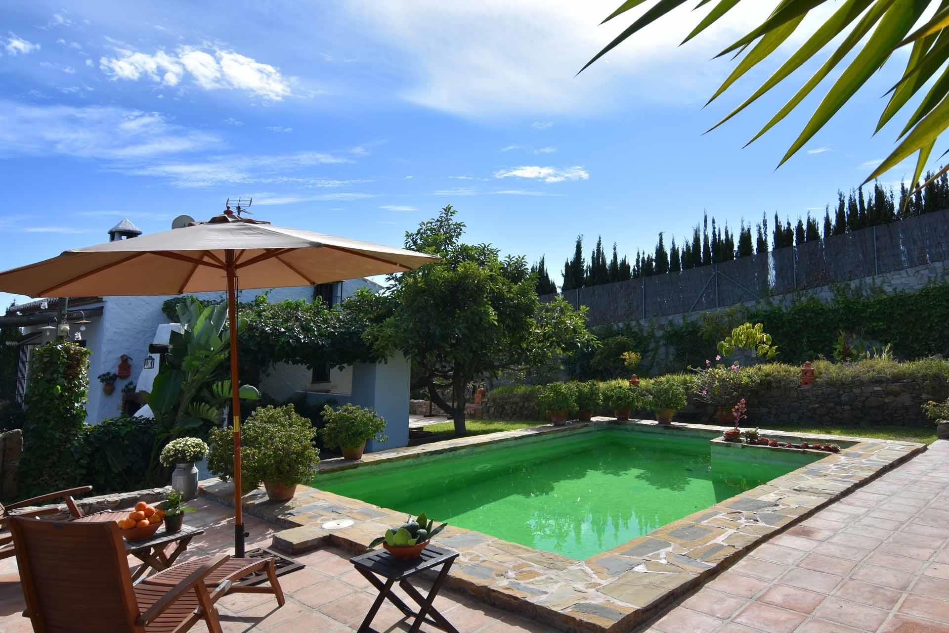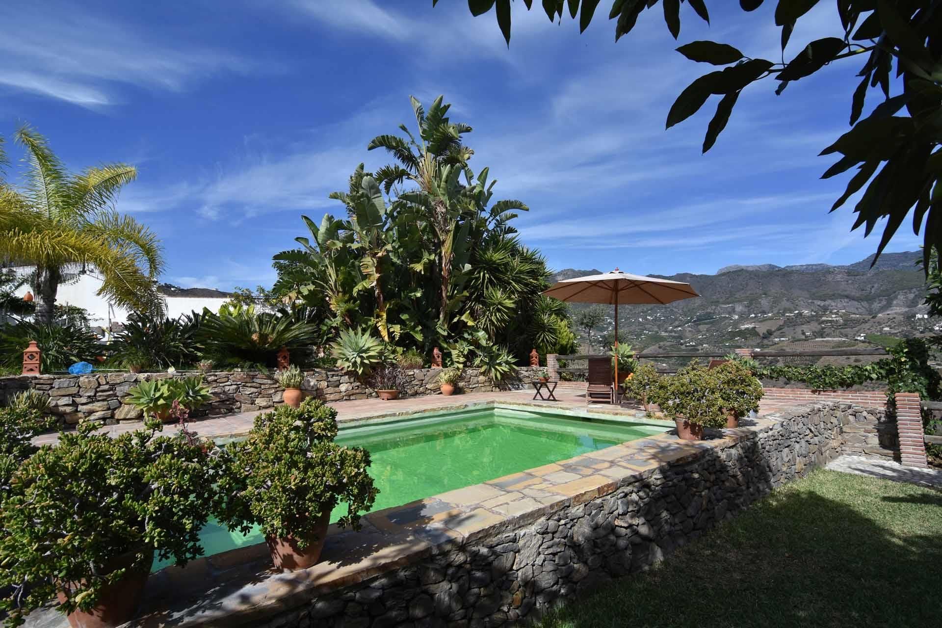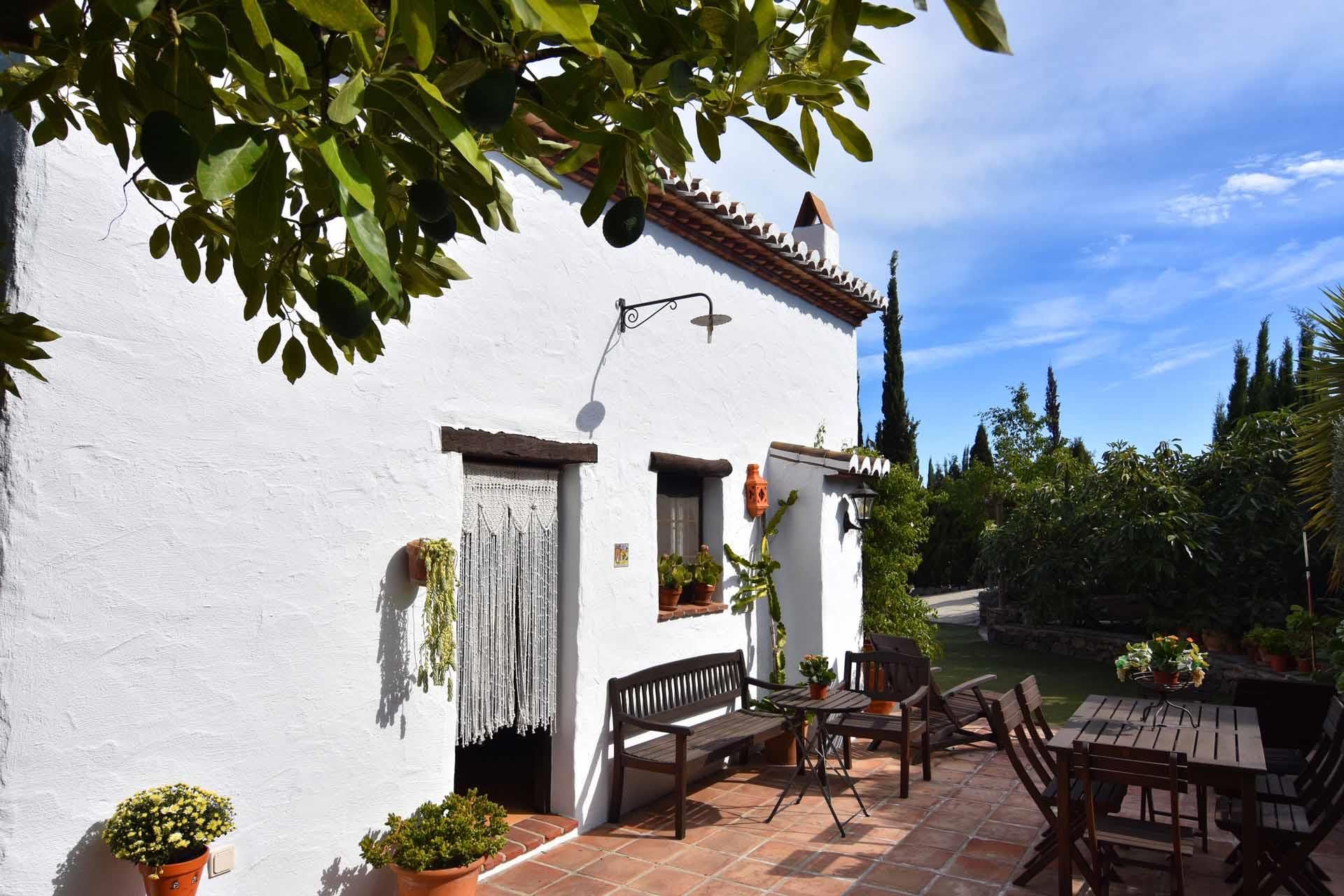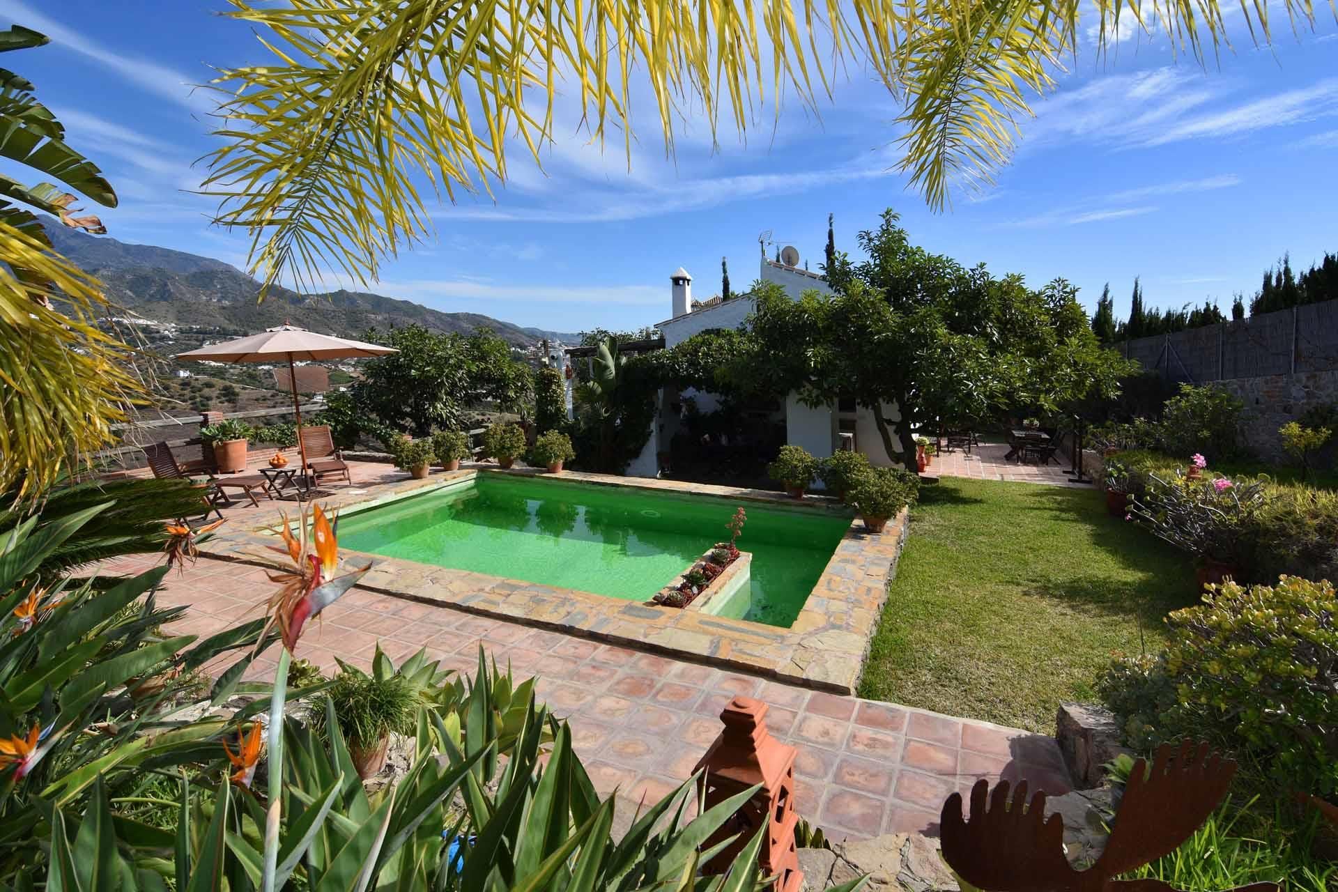 Fernando and Angela, the owners of this lovely countryside villa, wanted their newly built house to look like a true Andalusian cottage. They did not choose the easy way; they gave the walls that characteristic irregular shape of the old farmhouses, built beamed ceilings and a pebble stone terrace. The private pool (8m x4m; 1,20m - 1,90m deep), set in a structure of natural stone, is another example of the owners' intention to give it all an attractive look. The surrounding sun terrace is provided with 2 sun loungers and offers fantastic panoramic views over the mountains and the village of Frigiliana out to the Mediterranean. On both the east and west side of the cottage, you’ll find a relaxing terrace for sun and shade, surrounded by a garden with lawn and lots of flowers, plants, and trees. You will find dining amenities on this terrace.