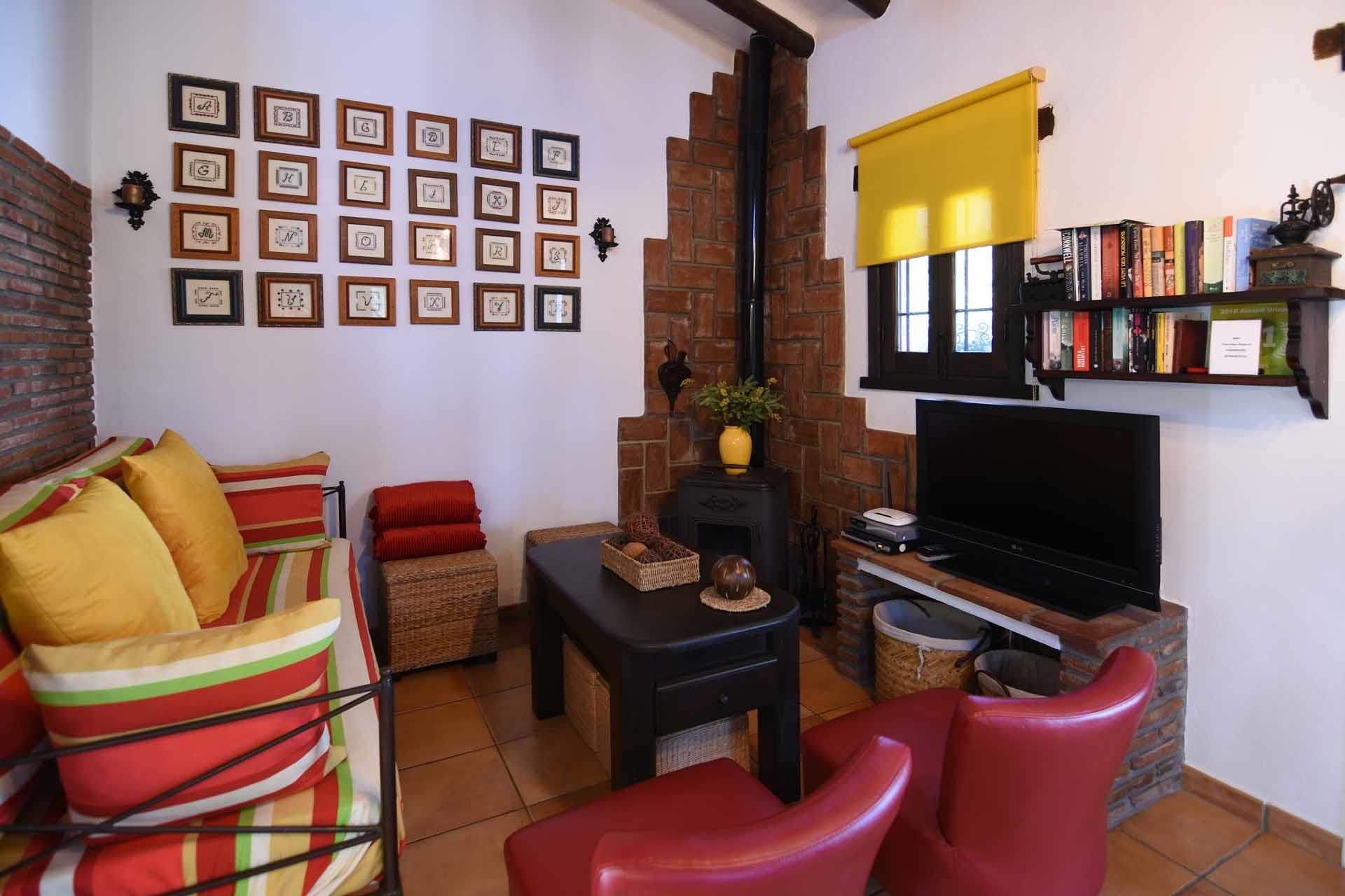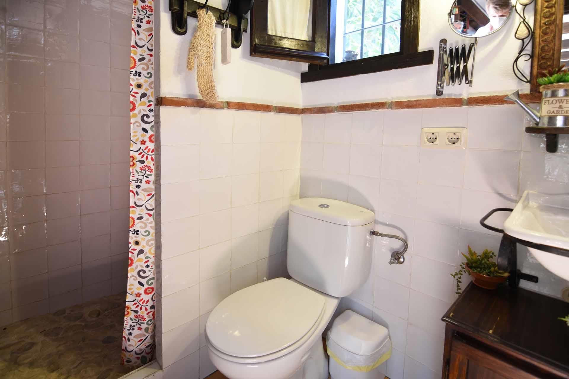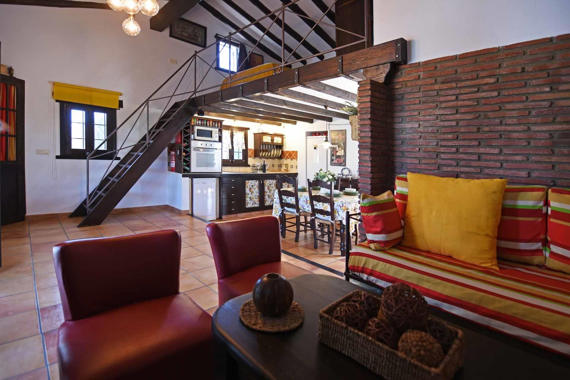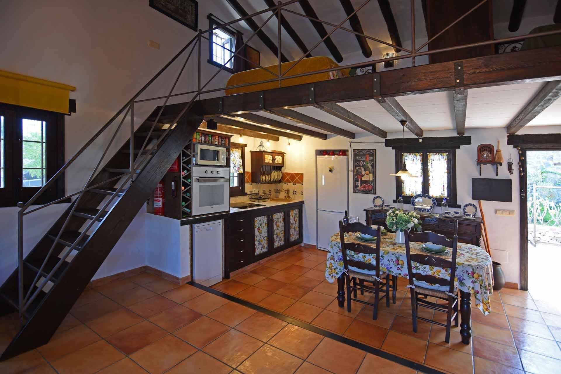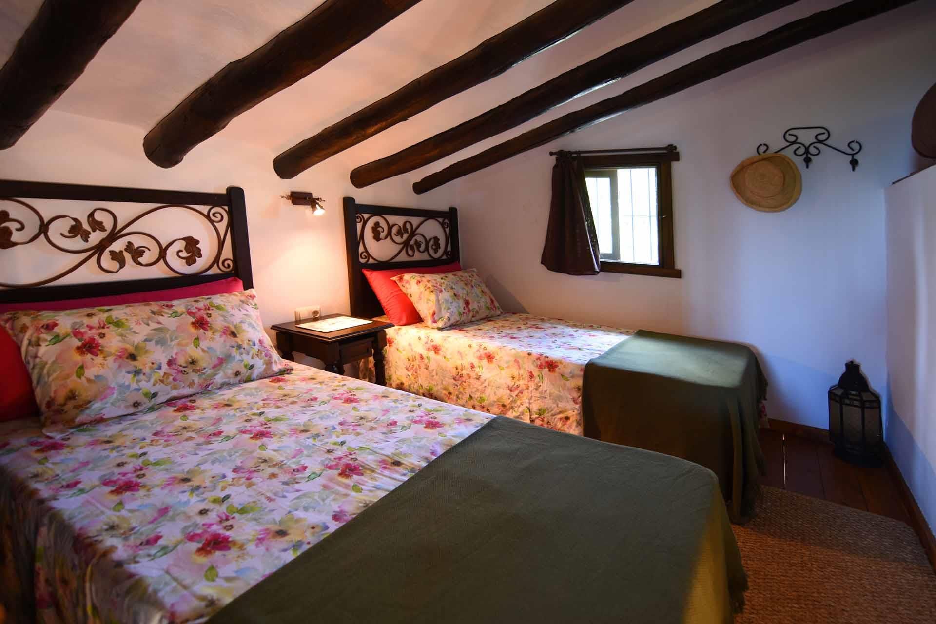 The property has been built in a traditional Andalusian style, with terracotta floors, beamed ceilings and an open-plan layout. From the sitting corner, provided with satellite-TV, DVD player, and a wood burning stove, it’s just one step down to the dining room and kitchen well equipped with refrigerator/freezer, 2 ringed vitro hob, microwave, and dishwasher. The washing machine is in a utility area. On the ground floor you will also find a shower room with WC. A staircase leads to a split-level bedroom with a double bed and, separated by a closet, two additional single beds (these 2 extra persons can be accommodated upon request, with an additional charge).