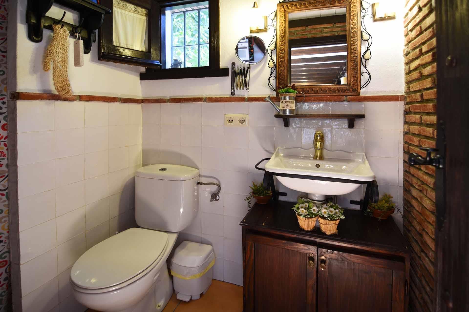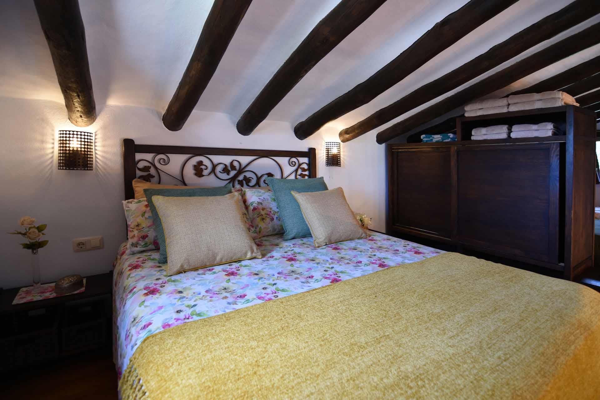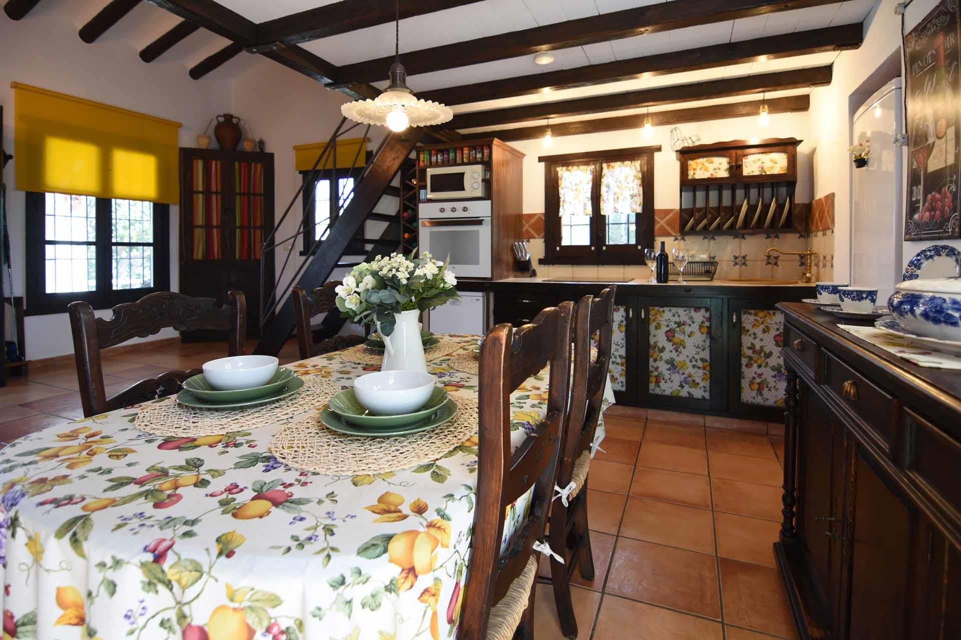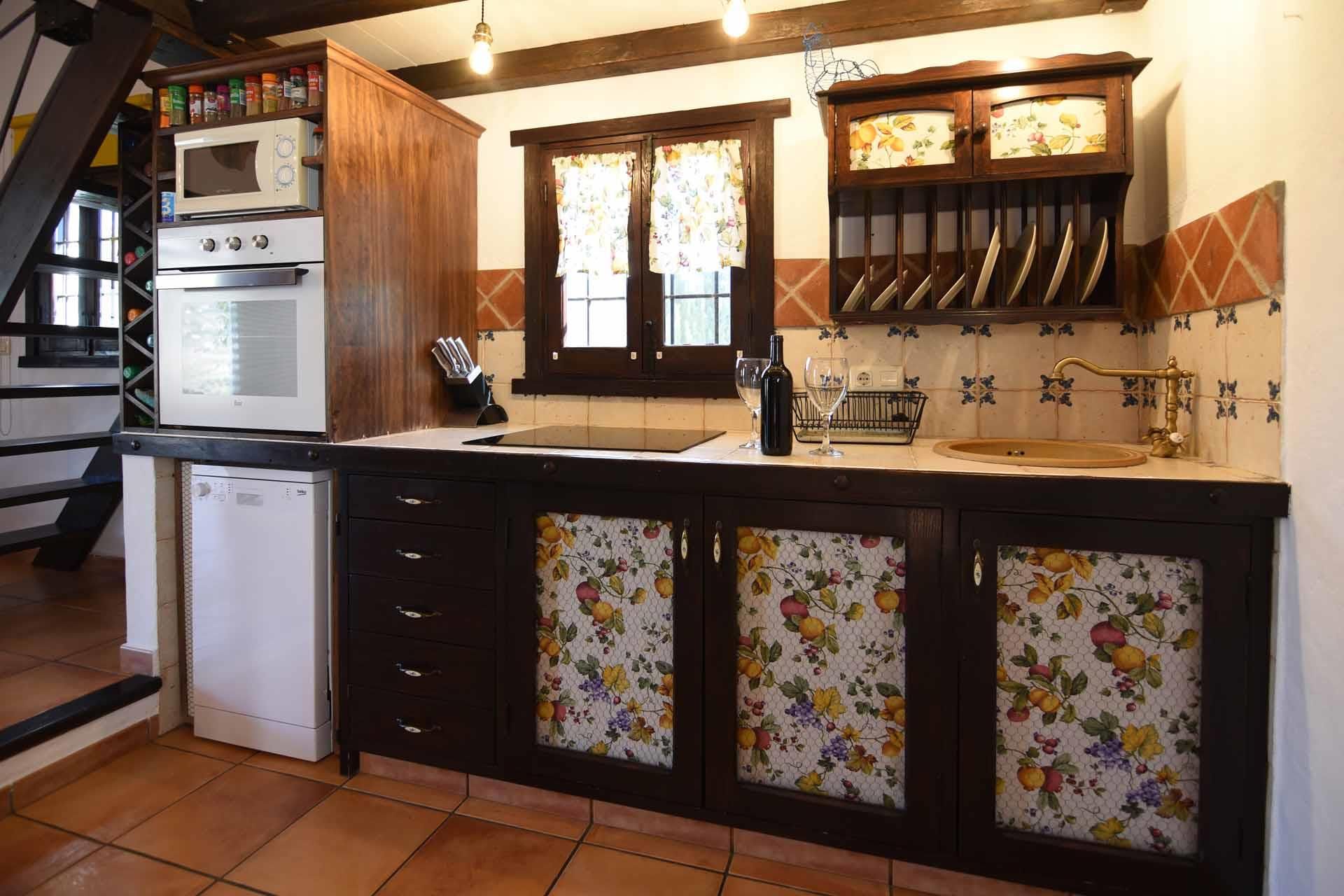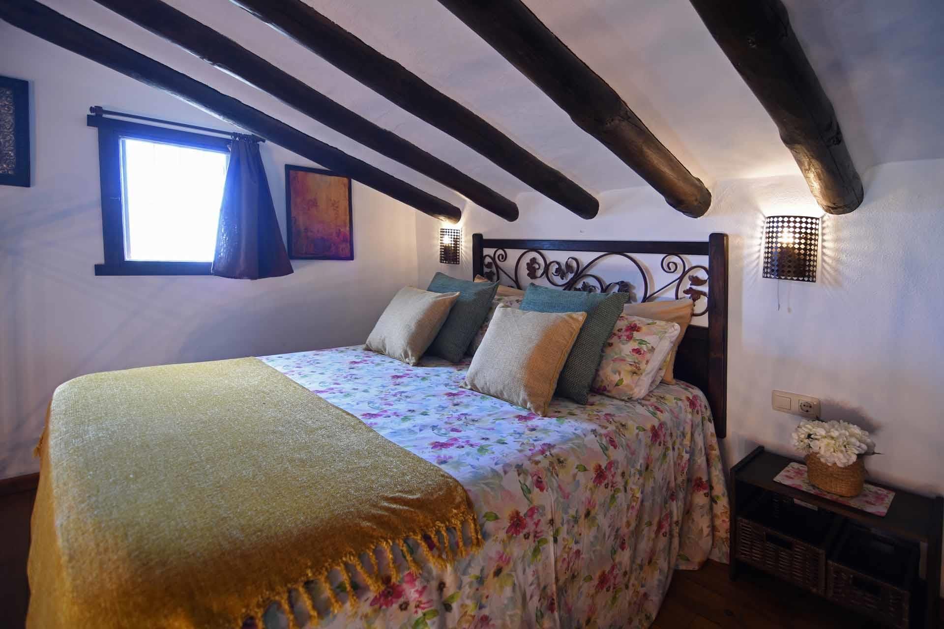 The property has been built in a traditional Andalusian style, with terracotta floors, beamed ceilings and an open-plan layout. From the sitting corner, provided with satellite-TV, DVD player, and a wood burning stove, it’s just one step down to the dining room and kitchen well equipped with refrigerator/freezer, 2 ringed vitro hob, microwave, and dishwasher. The washing machine is in a utility area. On the ground floor you will also find a shower room with WC. A staircase leads to a split-level bedroom with a double bed and, separated by a closet, two additional single beds (these 2 extra persons can be accommodated upon request, with an additional charge).
