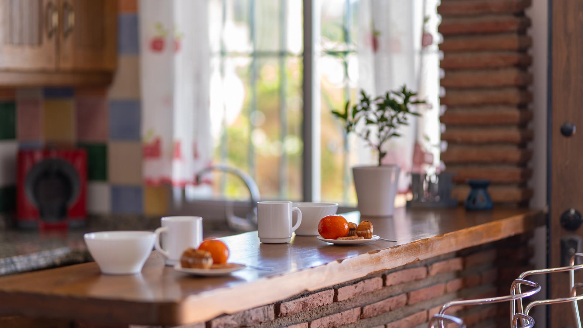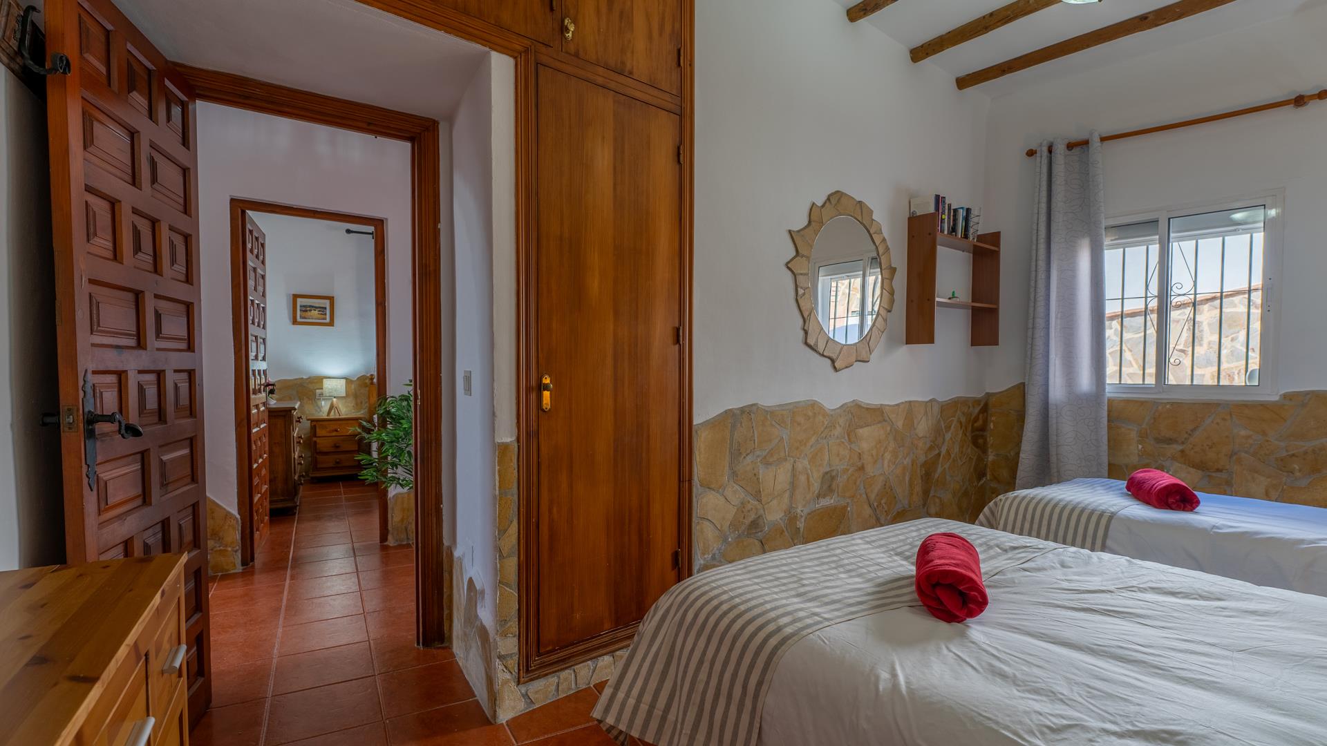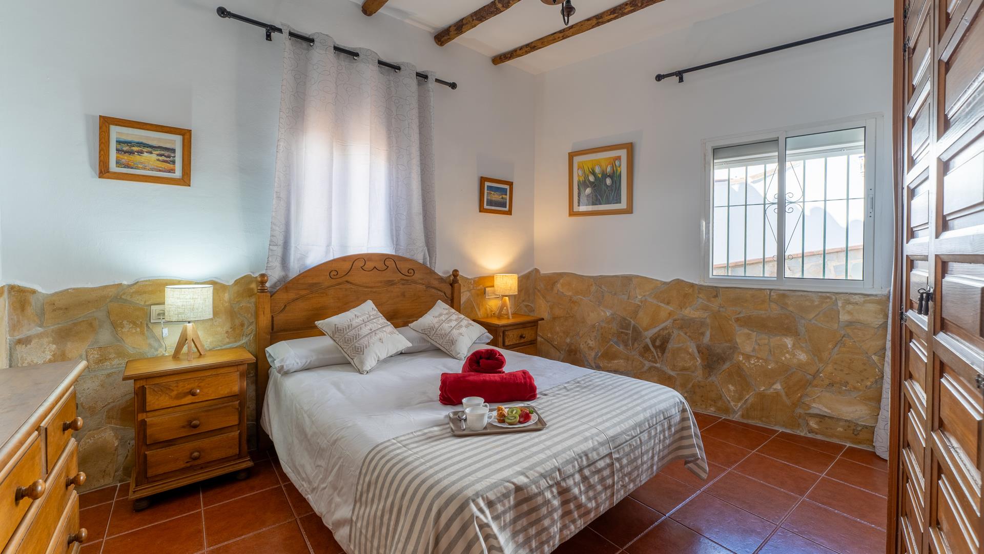 This traditional Andalusian holiday home is built on one level and well furnished, in a rustic style. The living area has dining and lounge furniture, an open fireplace, and satellite-TV. A brick arch gives entrance to the open-plan kitchen equipped with a 4 ringed gas hob, oven, microwave, refrigerator/freezer, and washing machine. The main bedroom sleeps 4 with a double bed and 2 single beds. The second bedroom is a twin. The house is provided with a shower room with WC, bidet, and basin. Although there are beds for 5 people, we find the house a better fit for 4 people—prices below are for 4 people. A supplement applies for a 5th person.