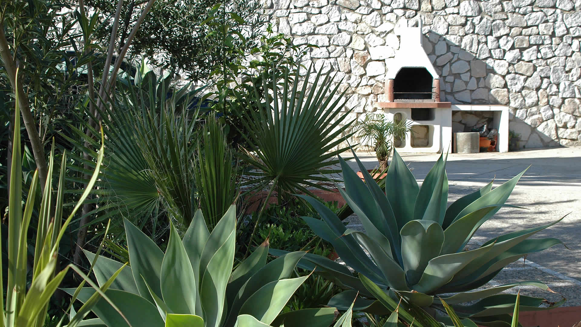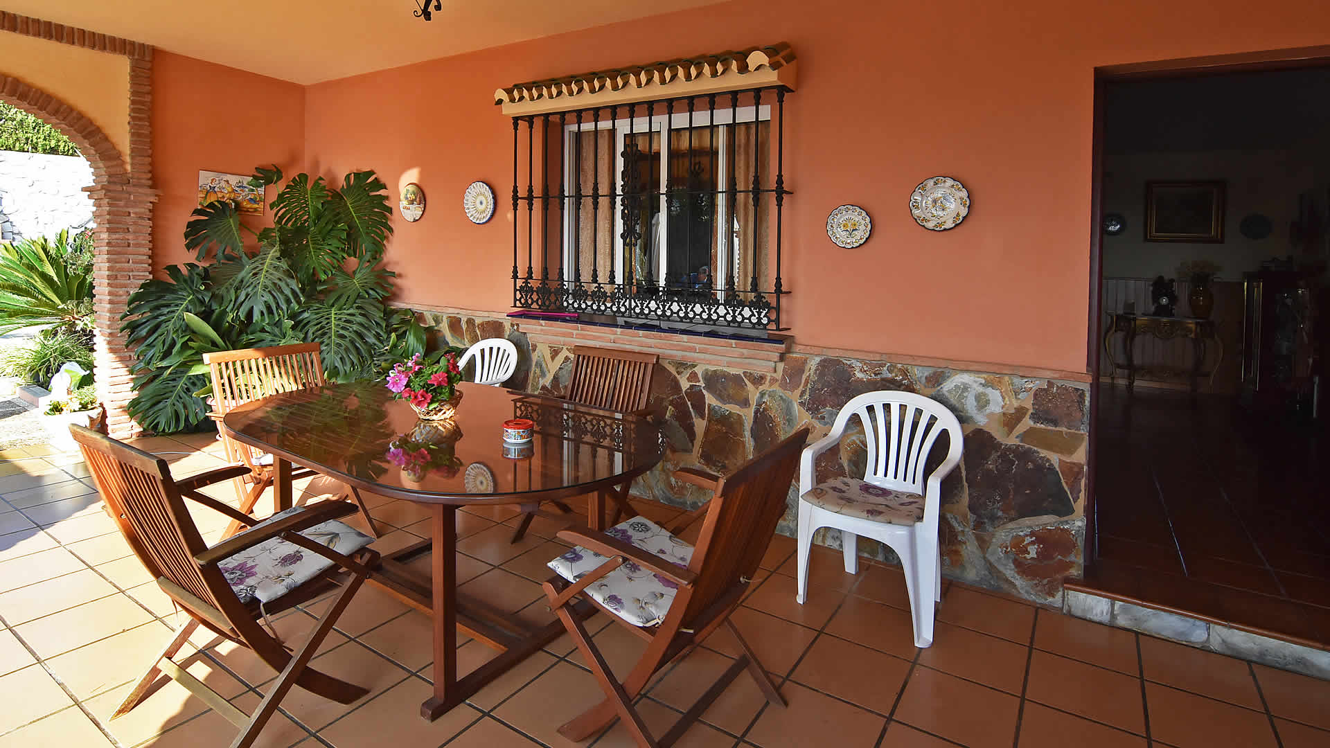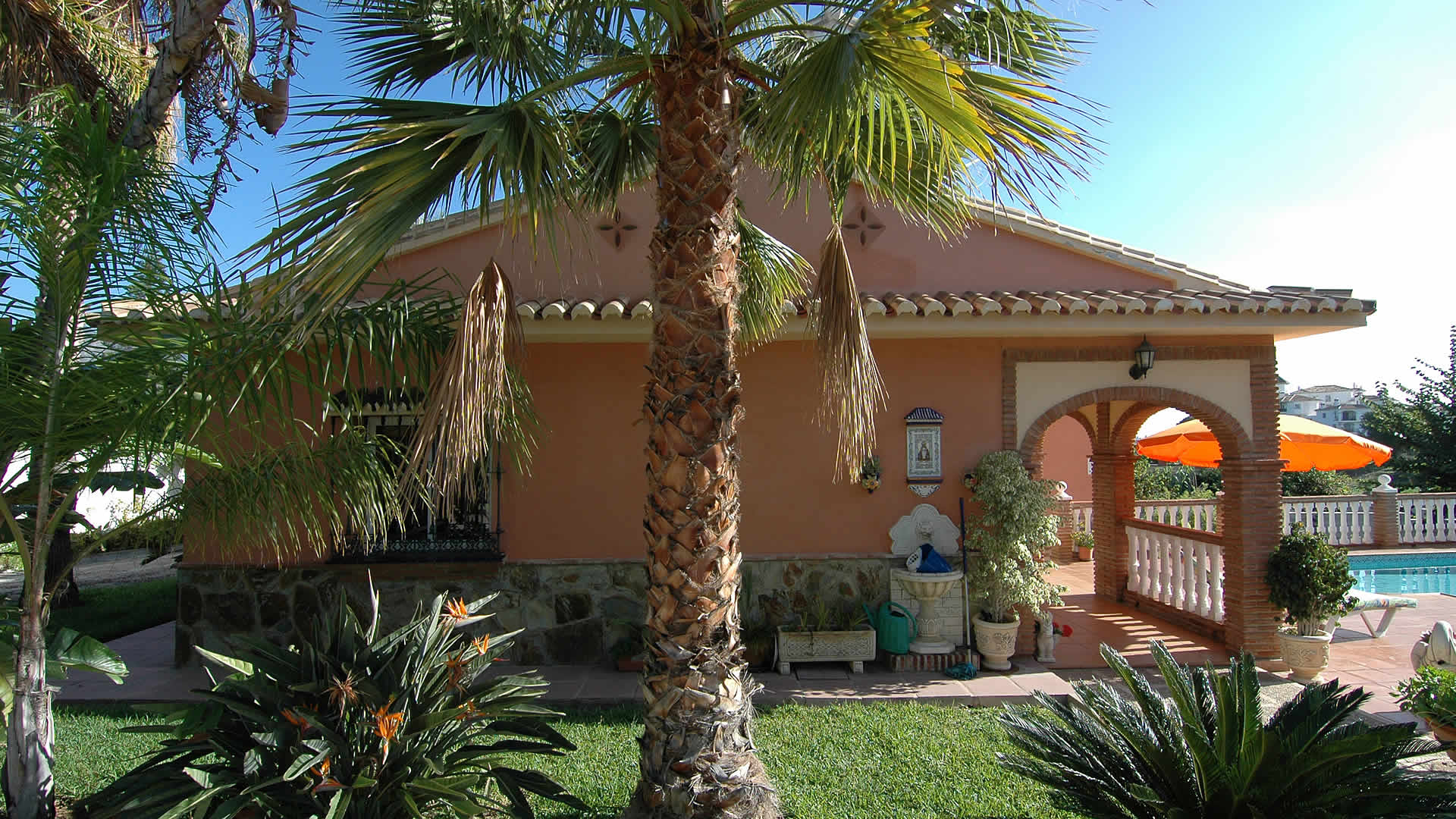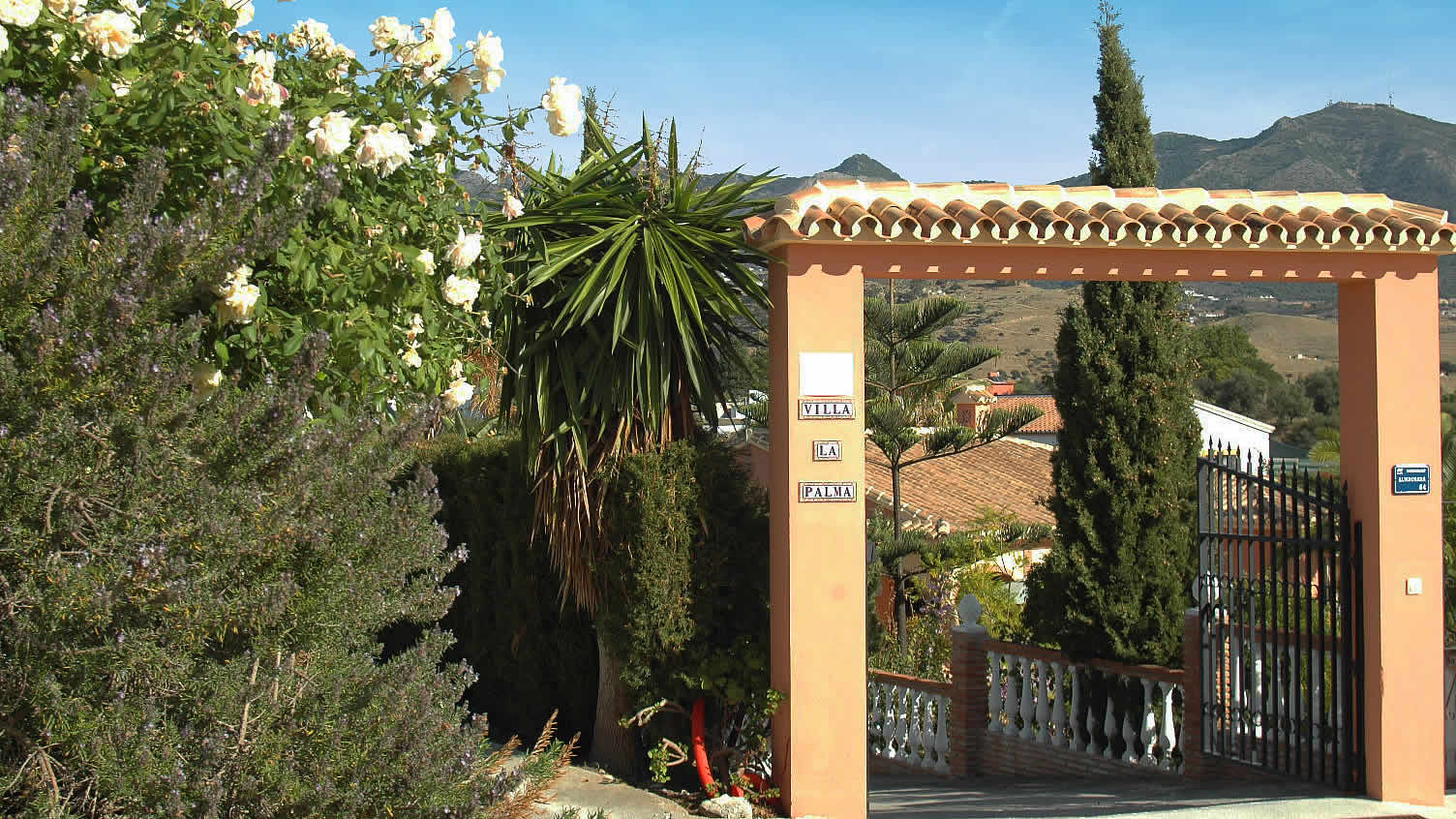 Villa La Palma has a striking, mature garden—one of the hallmarks of this villa. There are indeed palm trees, but also fruit trees and all kinds of flowers and plants. The villa is set in the rolling countryside between Mijas (5 km) and Fuengirola (4 km), providing a lovely country retreat with sea views and spacious outside area, perfect for outdoor living. The private pool (8x4 m) is south facing and surrounded by a sun-terrace with panoramic views over the countryside and the coast of Fuengirola, a perfect setting to enjoy an alfresco meal! Patio furniture, barbecue, and sun loungers are provided. If you wish to take shelter from the midday sun, then you can dream away during a siesta under the covered porch.