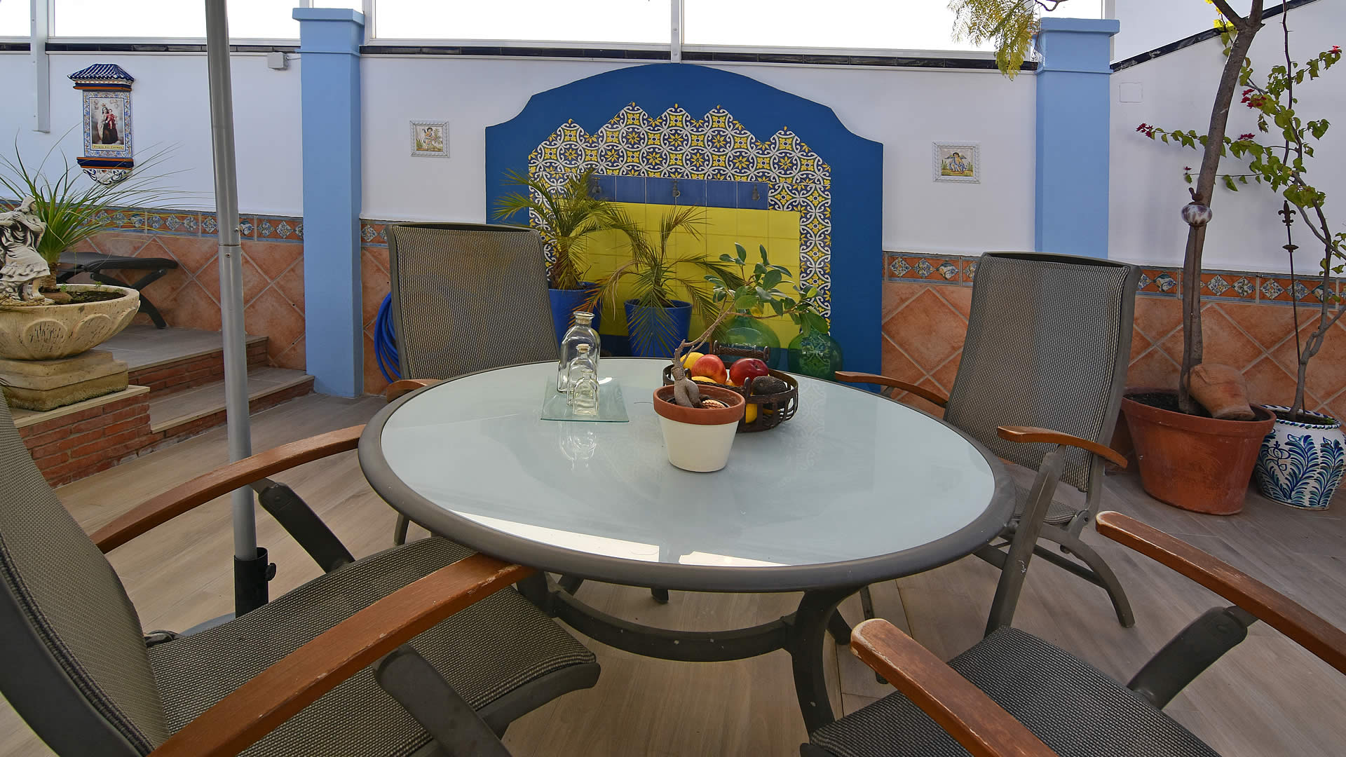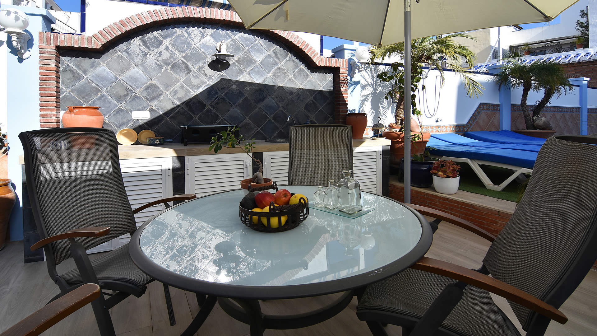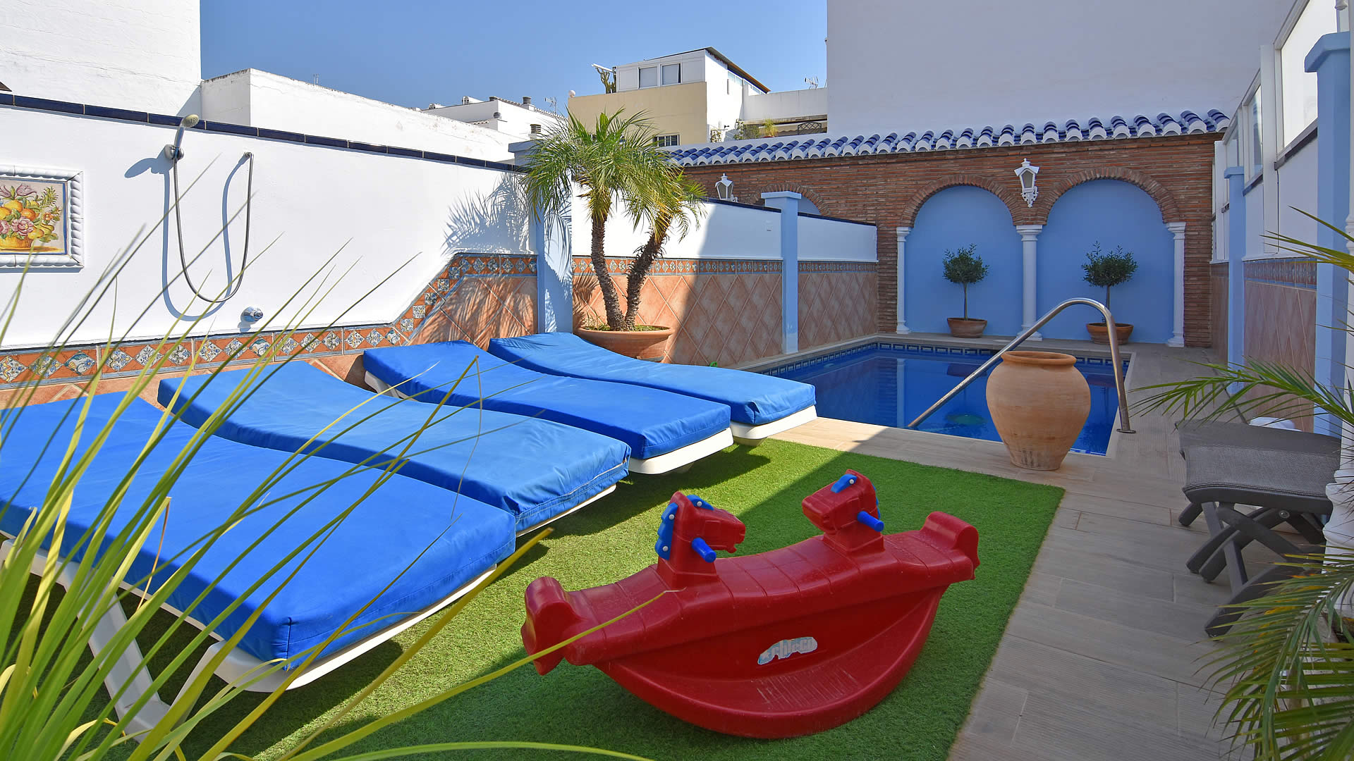 No need for a rental car, as you are only a few minutes’ walk away from Nerjas' playa Calahonda and the many tapas bars, restaurants and shops in central Nerja. Due to the high demand for street parking space on this central location, we suggest arriving by taxi. Those who wish to visit the beautiful Andalusian cities can either take public transport from the nearby bus station in the Avenida de Pescia (at 200m) or a guided tour. Behind the façade of a traditional Spanish townhouse, you’ll find a spacious accommodation – from the Calle Mendez Nuñez, steps lead up to the front door which opens into the classic styled lounge/dining area. On the rear you’ll find a relaxing terrace area with a brick BBQ and a table and chairs to enjoy alfresco dining, overlooking the private swimming pool (3x5m, deep 1.5m). On the upper floor, the ample roof terrace offers another option for sun addicts to relax and soak up the sun.