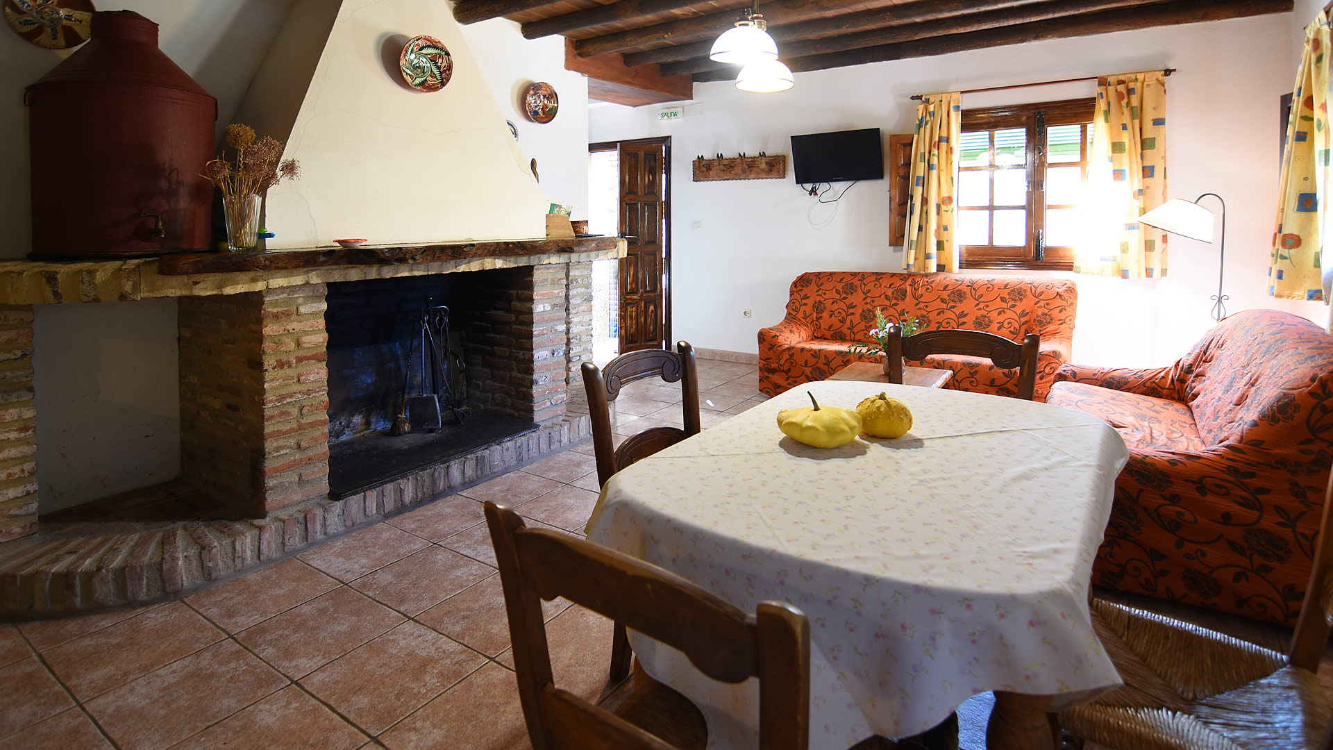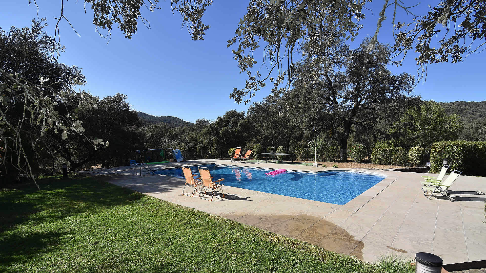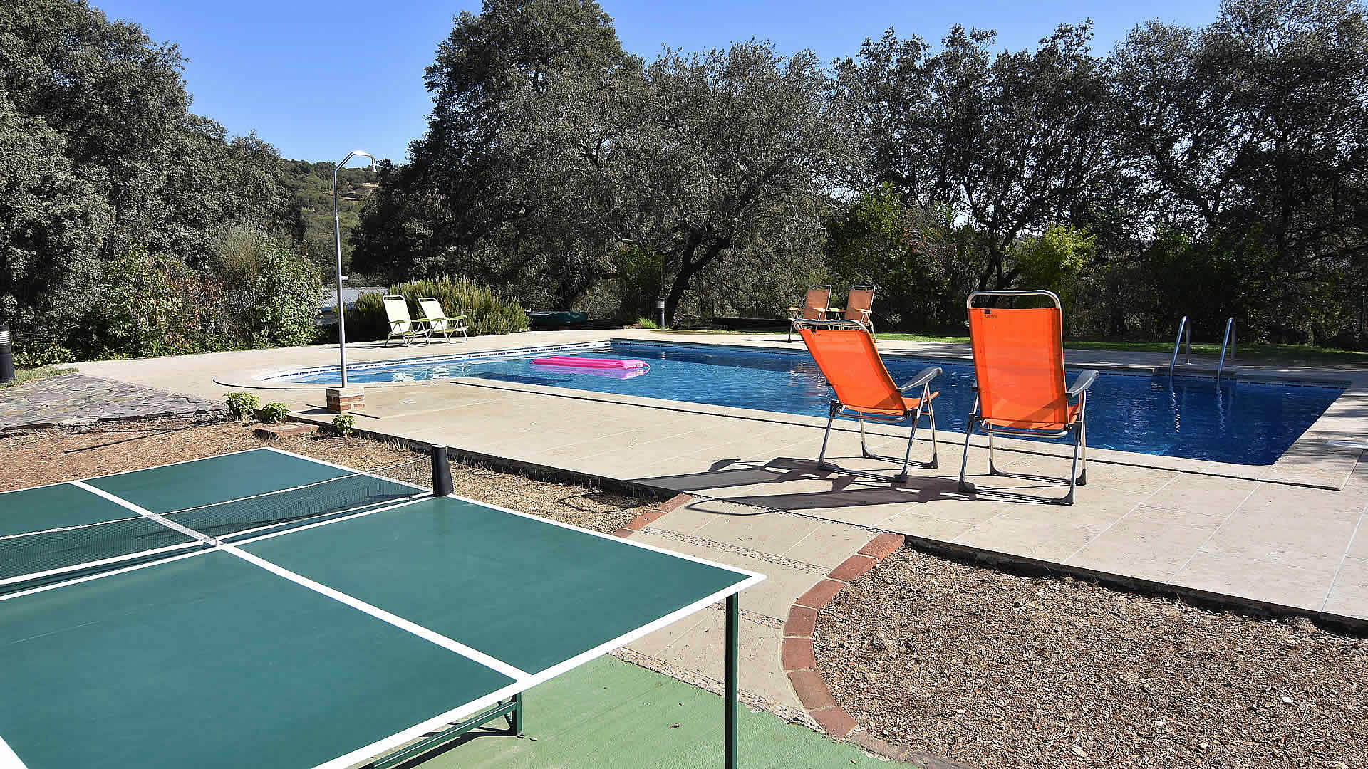 A country road leads to this farmhouse set amidst cork and holm oaks. The house has its own garden area including garden furniture and barbecue. The pool is for shared use with the Cortijo Aracena 004 and the owners. Their children, when not going to school, spend their time with friends playing on the farm and around the pool which makes it easy to meet new friends. For shopping or a tapa bar, the nearby village of El Repilado is only 5 minutes by car and provides the basic needs, whilst the bigger town of Cortegana is about 10 km away. Its central location within the the Sierra de Aracena Natural Park allows you to discover all the treasures of the park. Don’t forget to sample the excellent gastronomy of the region, famous for its "jamon de pata negra" and other products made from the Iberian black pig. Armando and Lola were born and raised in the area and can provide you with wonderful suggestions for walking and horse or bike riding! It is also possible to experience the organic farm: Armando raises Iberian pigs, makes his own "jamón" and takes care of the ecological vegetable garden, whilst his wife Lola works on products such as goat cheese and will be your gracious host during your stay. Lola also takes care of your reception and will accompany you to the house.