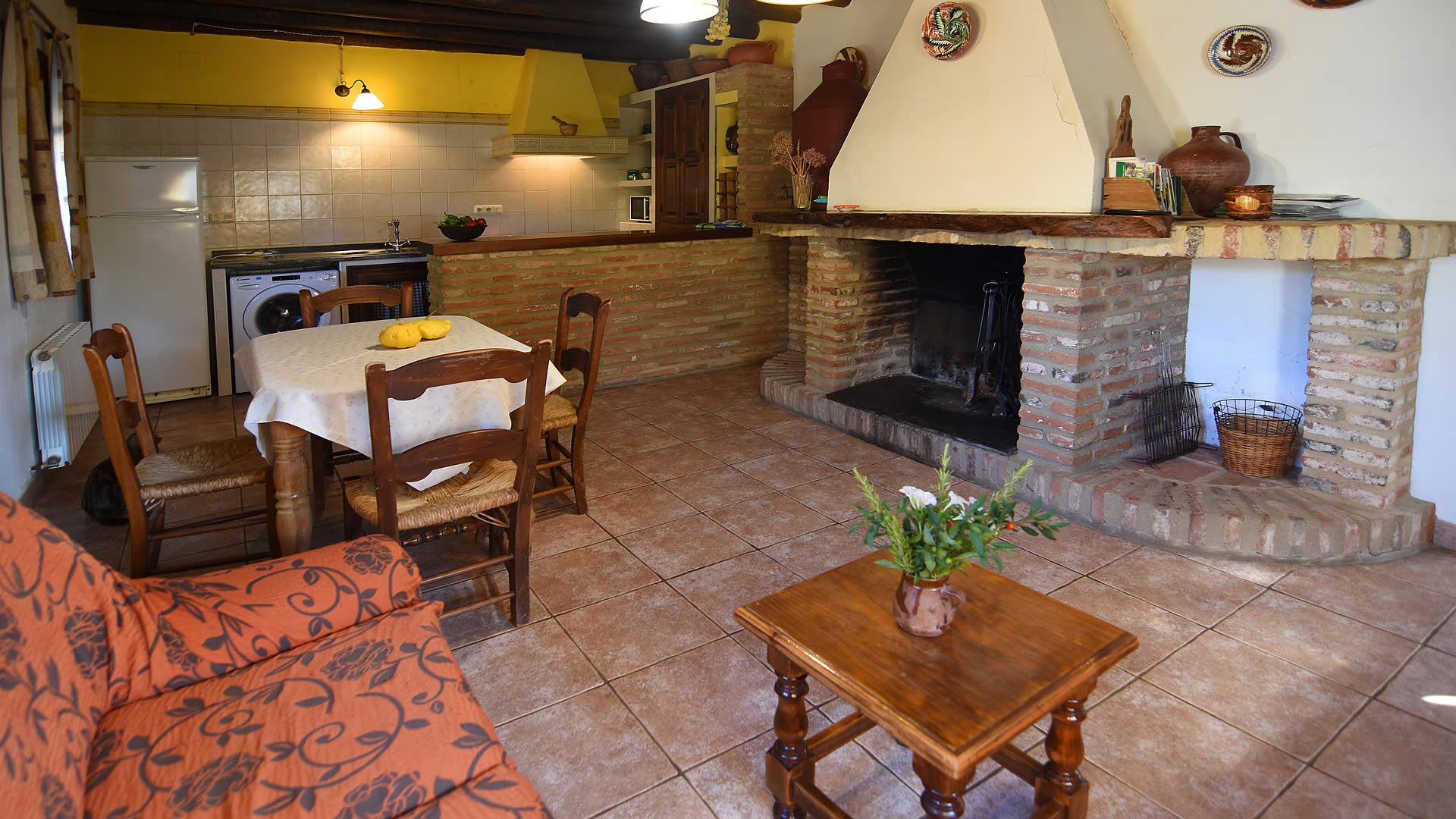The house is set on two floors, comfortable and decorated in the lovely rustic and typical style of the area. The ground floor consists of a living/dining room with an open-plan kitchen and a WC. On the first floor there is one double and one twin bedroom, each with a bathroom. One of the bedrooms also has a sofa-bed for an additional person. The living room creates a homy feeling with a big open fireplace, sofa, and television. The kitchen is equipped with a 4 ringed gas hob, microwave, washing machine, and the necessary kitchen utensils. There is central heating.