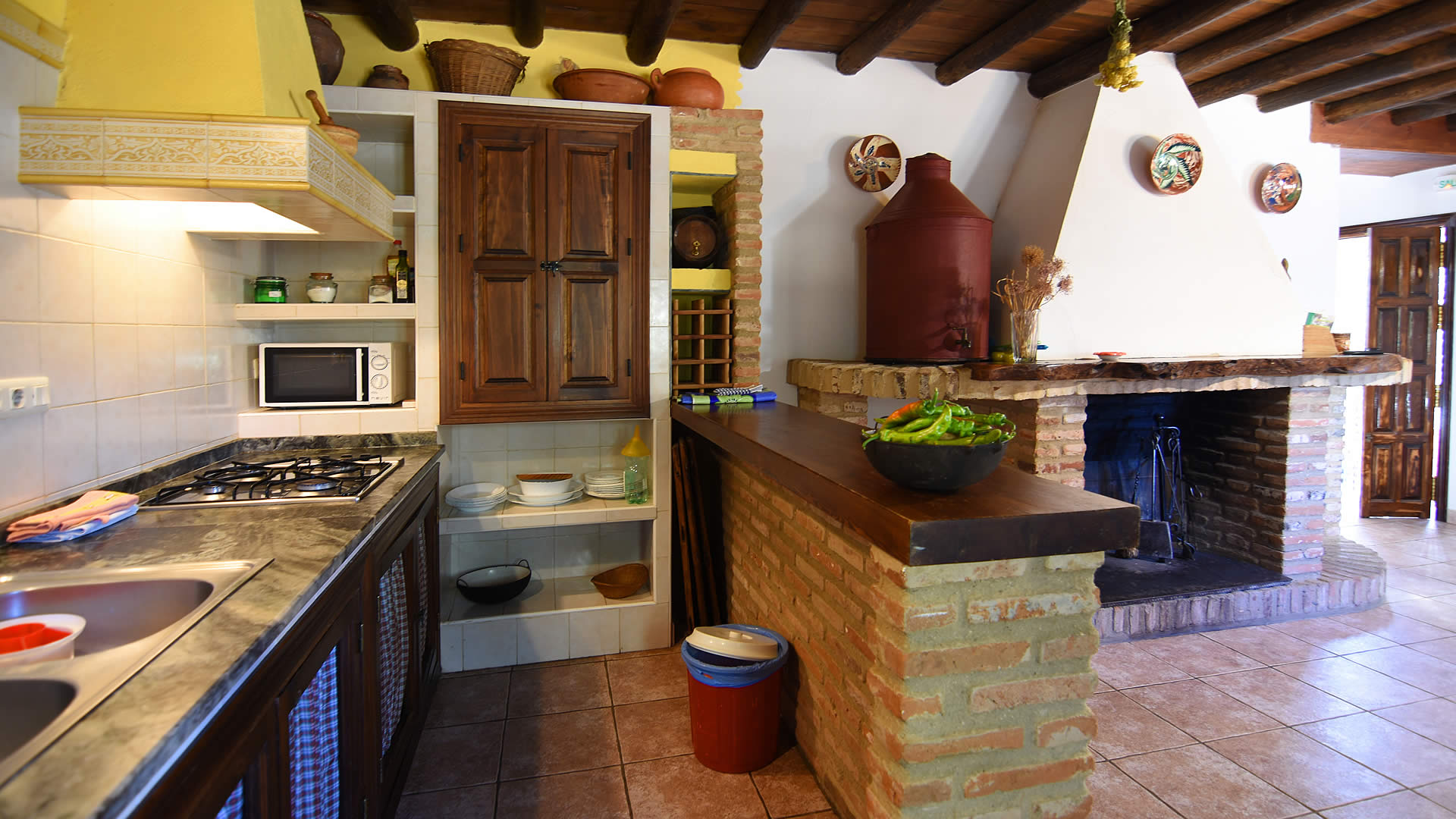 - open kitchen with gas hob, microwave, refrigerator-freezer, coffee machine, electric kettle, mixer, toaster and juicer