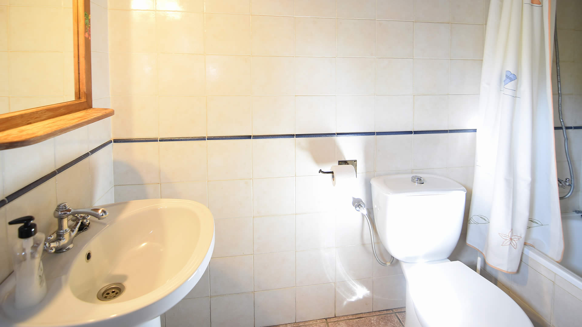 - bathroom with single washbasin, shower and toilet