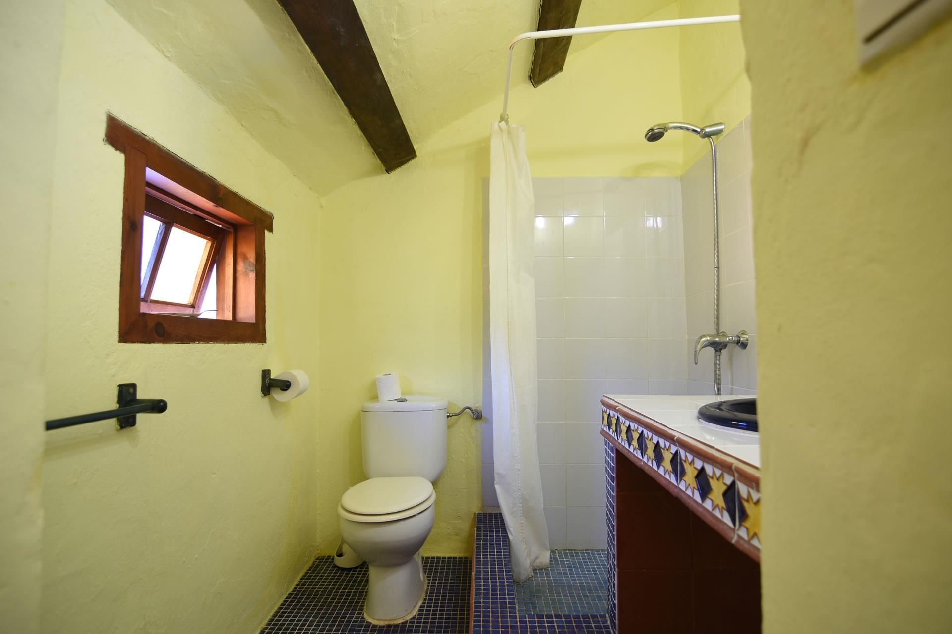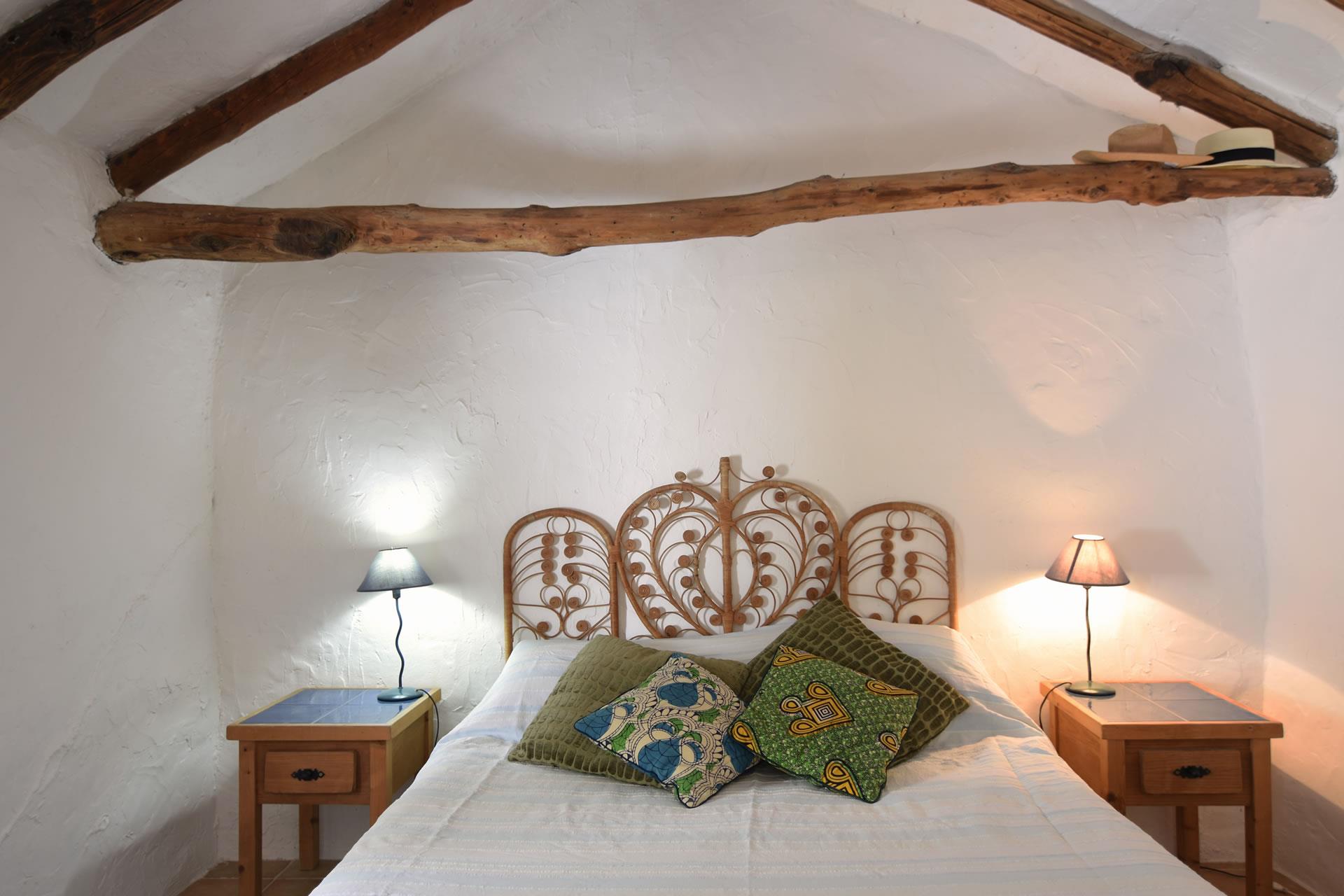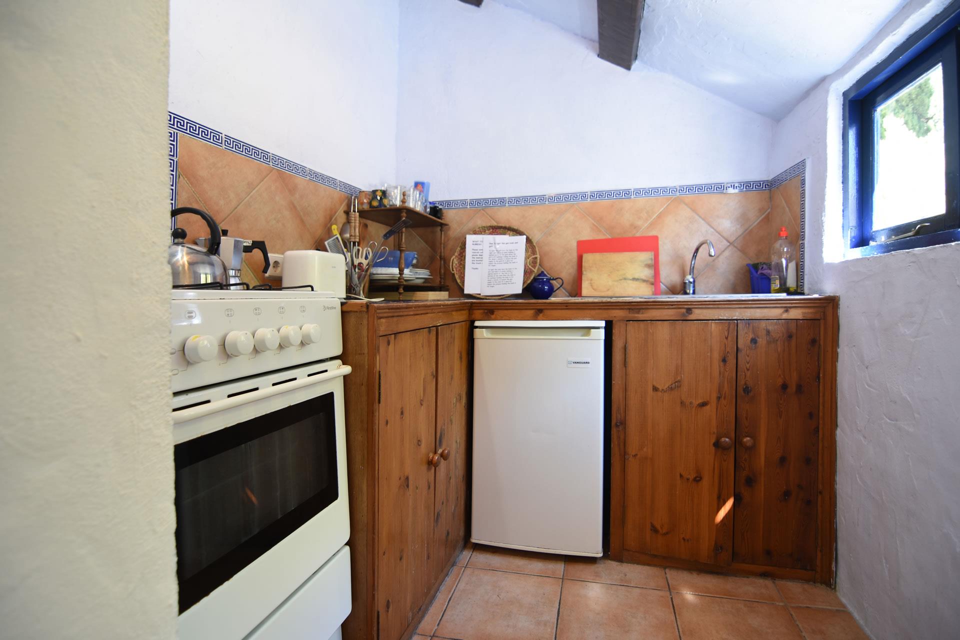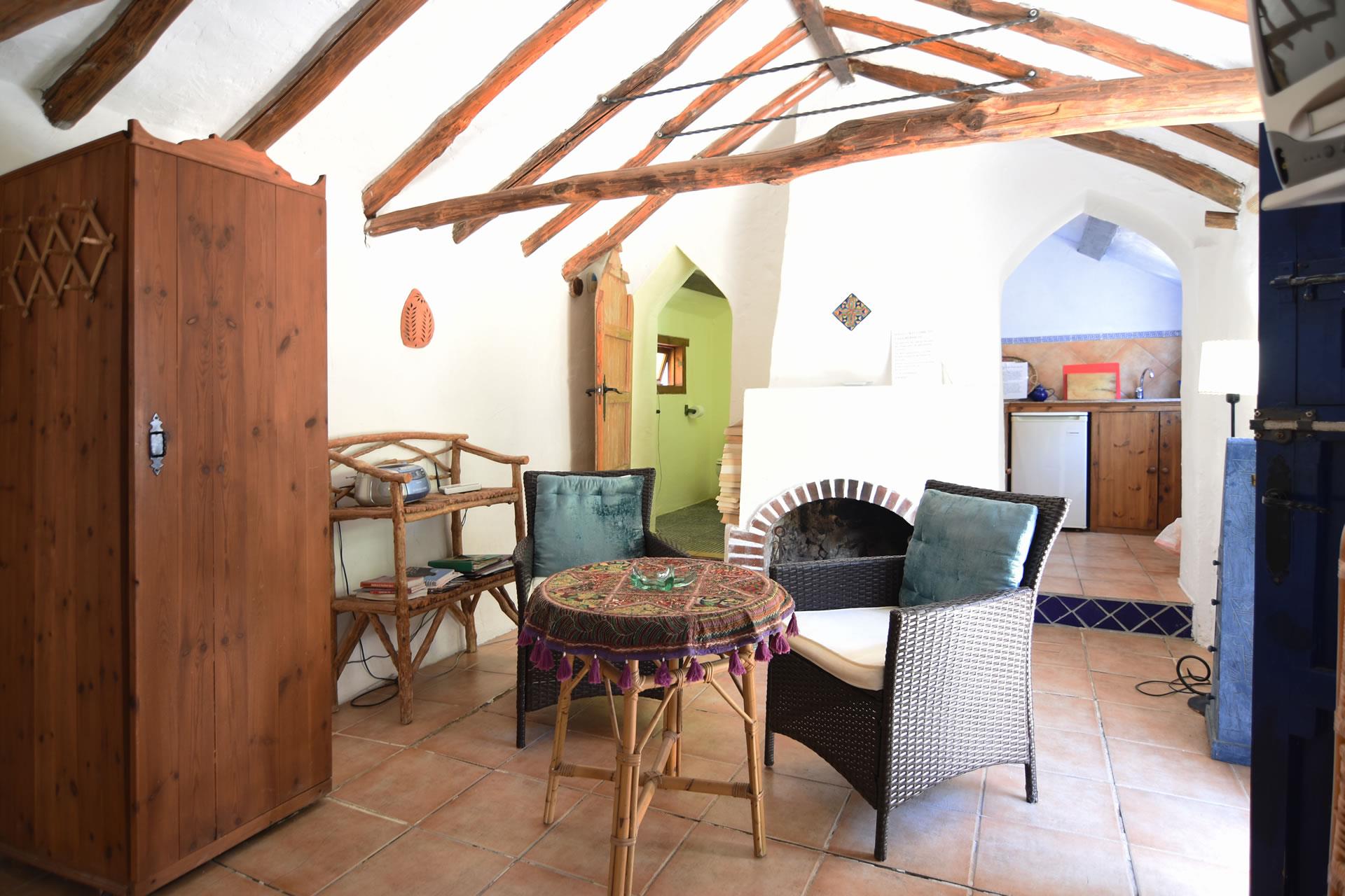 Inside, the cottage is a romantic retreat that has been tastefully furnished by Kate, the owner, providing a good level of comfort and a rustic ambience with chestnut-beamed ceilings and rose terracotta floors. The cottage boasts a king-size double bed and handsome furnishings in the open plan living/sleeping suite with comfortable arm chairs, TV, DVD and a music centre. An antique arched door to the left leads to a colourful bathroom with hand painted Andalucian tiles. To the right is a compact kitchen with 4 rings gas hob, oven, fridge with freezer compartment, toaster and kettle. Laundry facilities and iron + board are available.