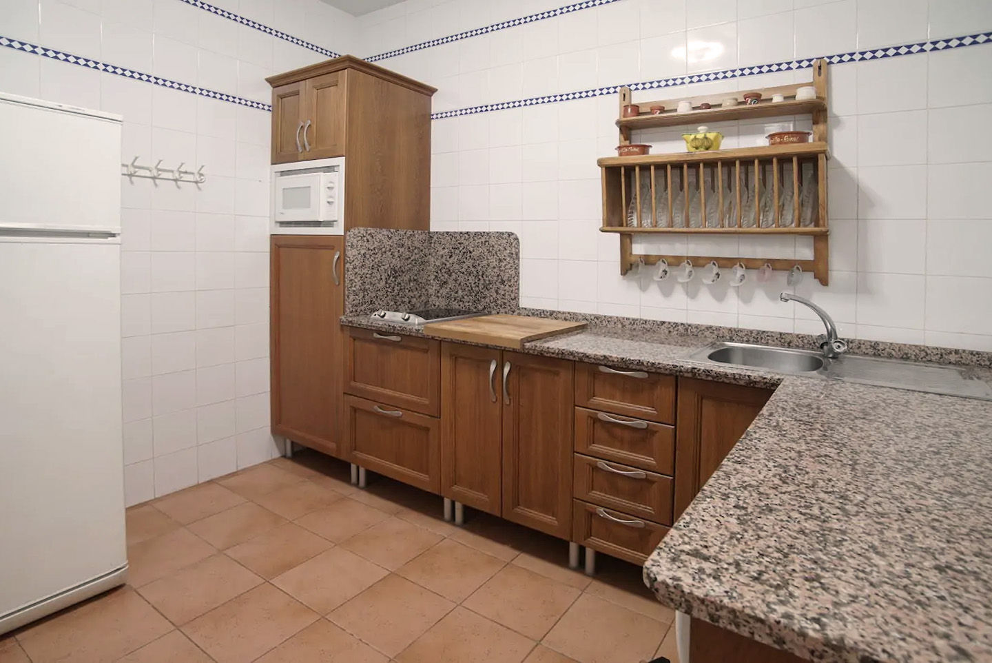 - kitchen with electric hob, microwave, refrigerator-freezer, coffee machine, mixer, toaster and juicer